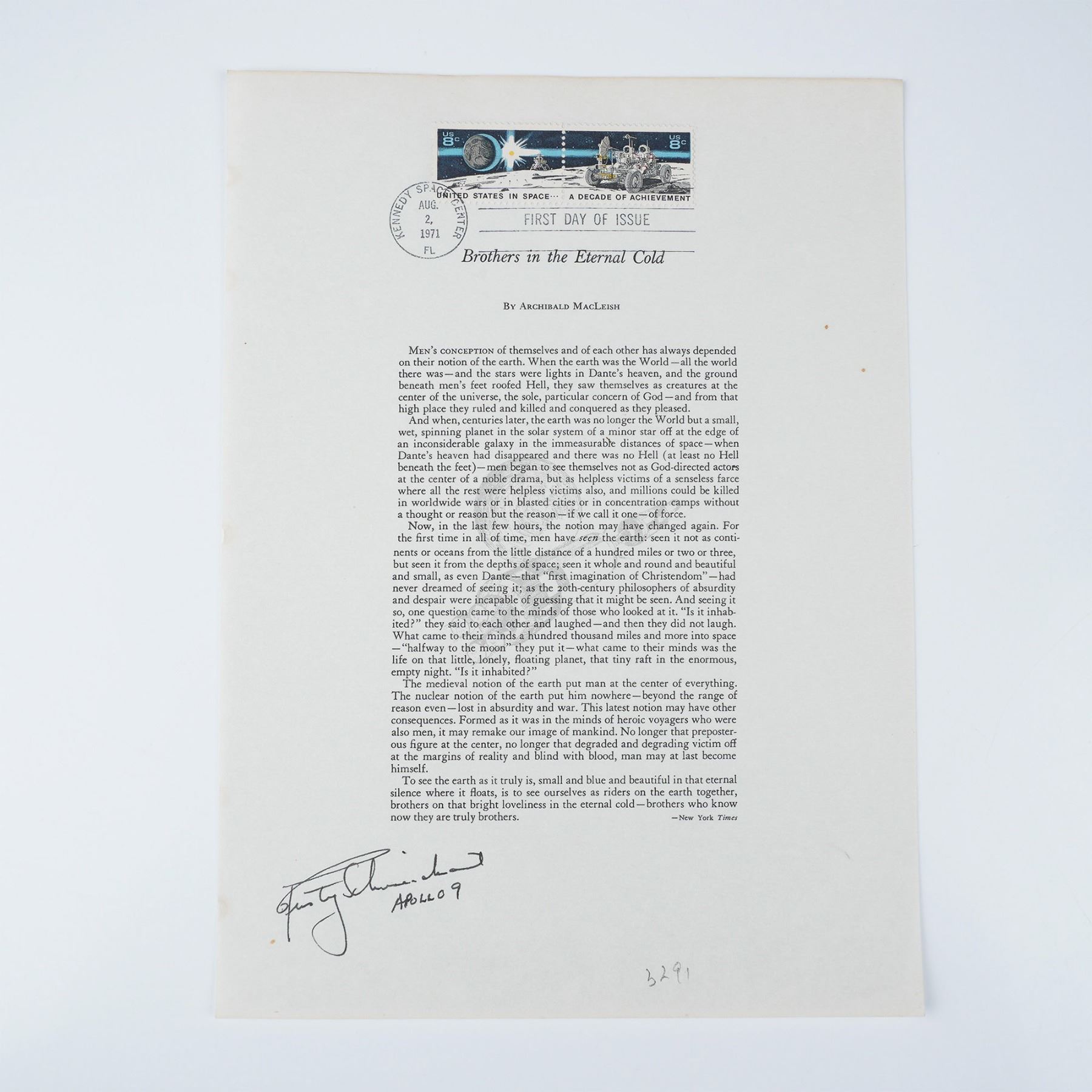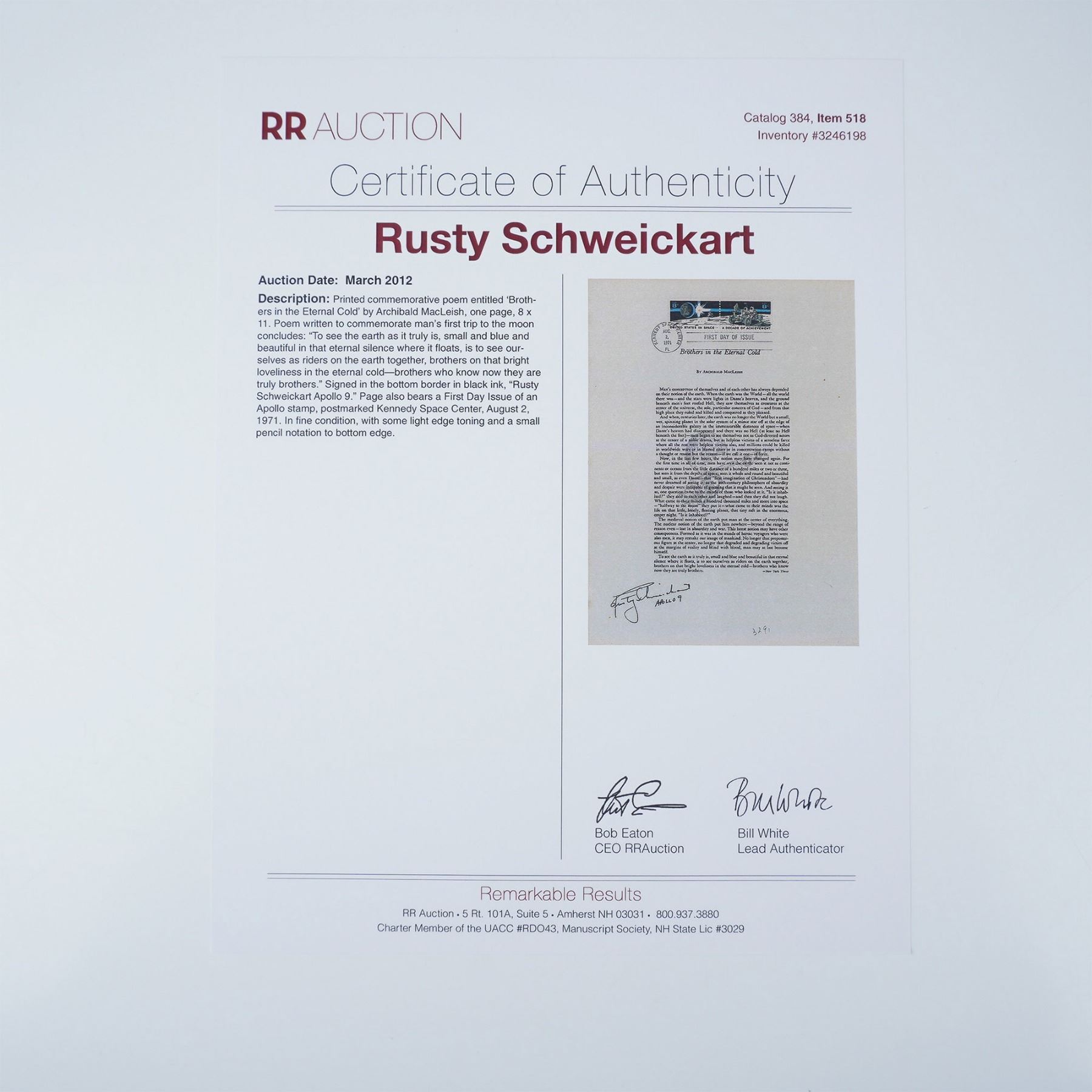 A printed commemorative poem titled "Brothers In The Eternal Cold" by Archibald MacLeish, created to honor humanity's first journey to the Moon during the Apollo 8 mission in 1968. The poem reflects on the profound perspective gained from seeing Earth from space-a small, fragile world suspended in the vastness of the universe. The print is autographed by astronaut Rusty Schweickart in black ink and features an Apollo stamp with a postmark from Kennedy Space Center, dated August 2, 1971. Rusty Schweickart (born 1935) is an American astronaut who flew as the Lunar Module Pilot on Apollo 9, the first crewed flight of the Lunar Module. Schweickart is also well known for performing the first spacewalk during the Apollo 9 mission, a key test in preparation for the Moon landings. His contributions to space exploration and his role in advancing astronaut safety and technology made him a significant figure in the Apollo program. This lot includes a RR Auction Certificate of Authenticity, verifying the signature's authenticity.