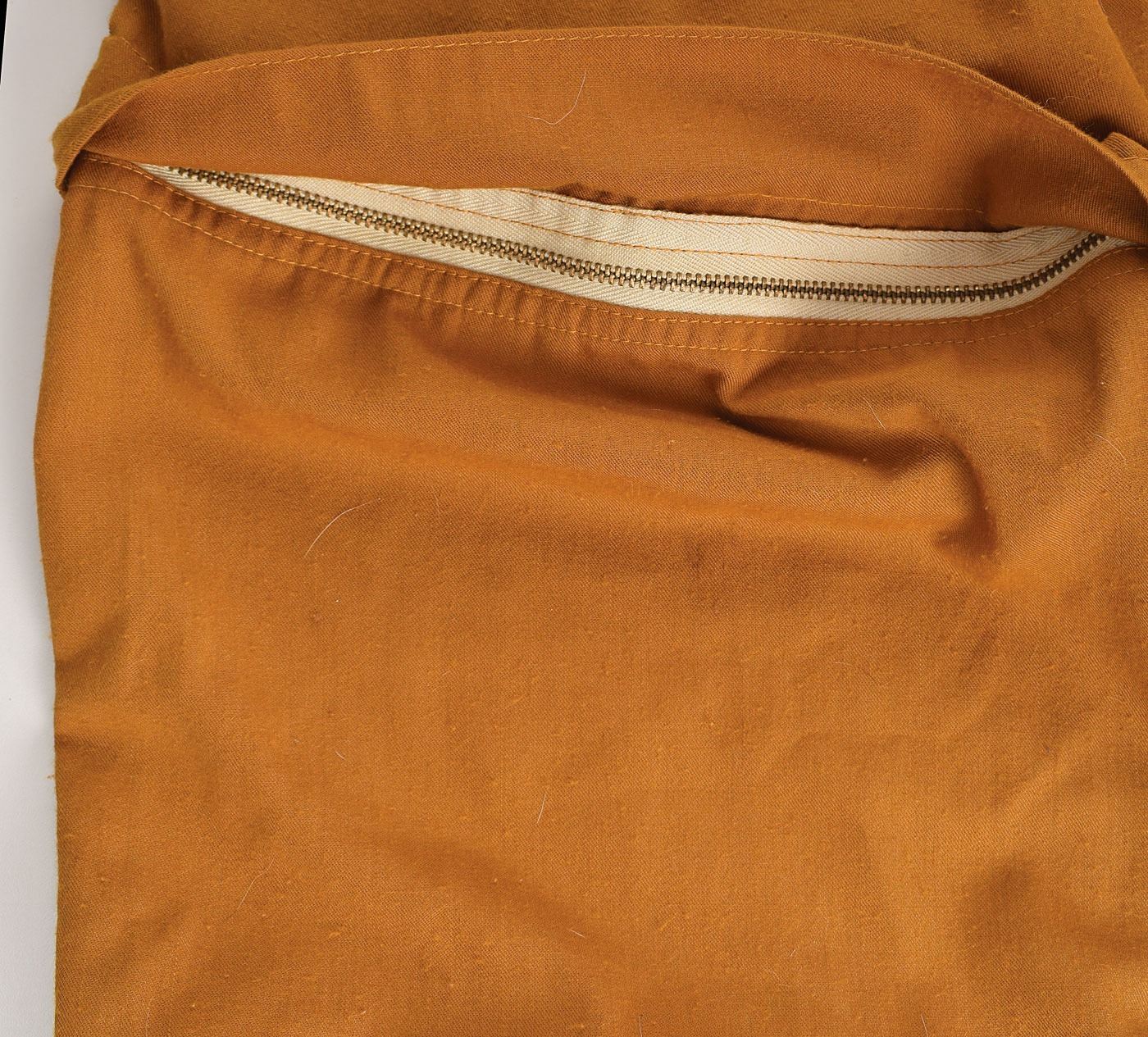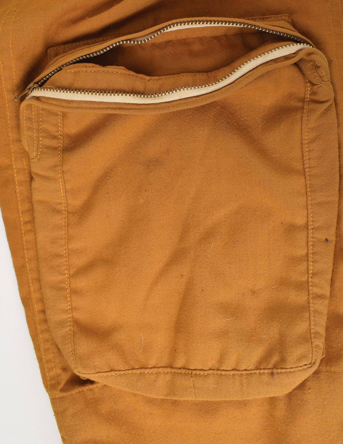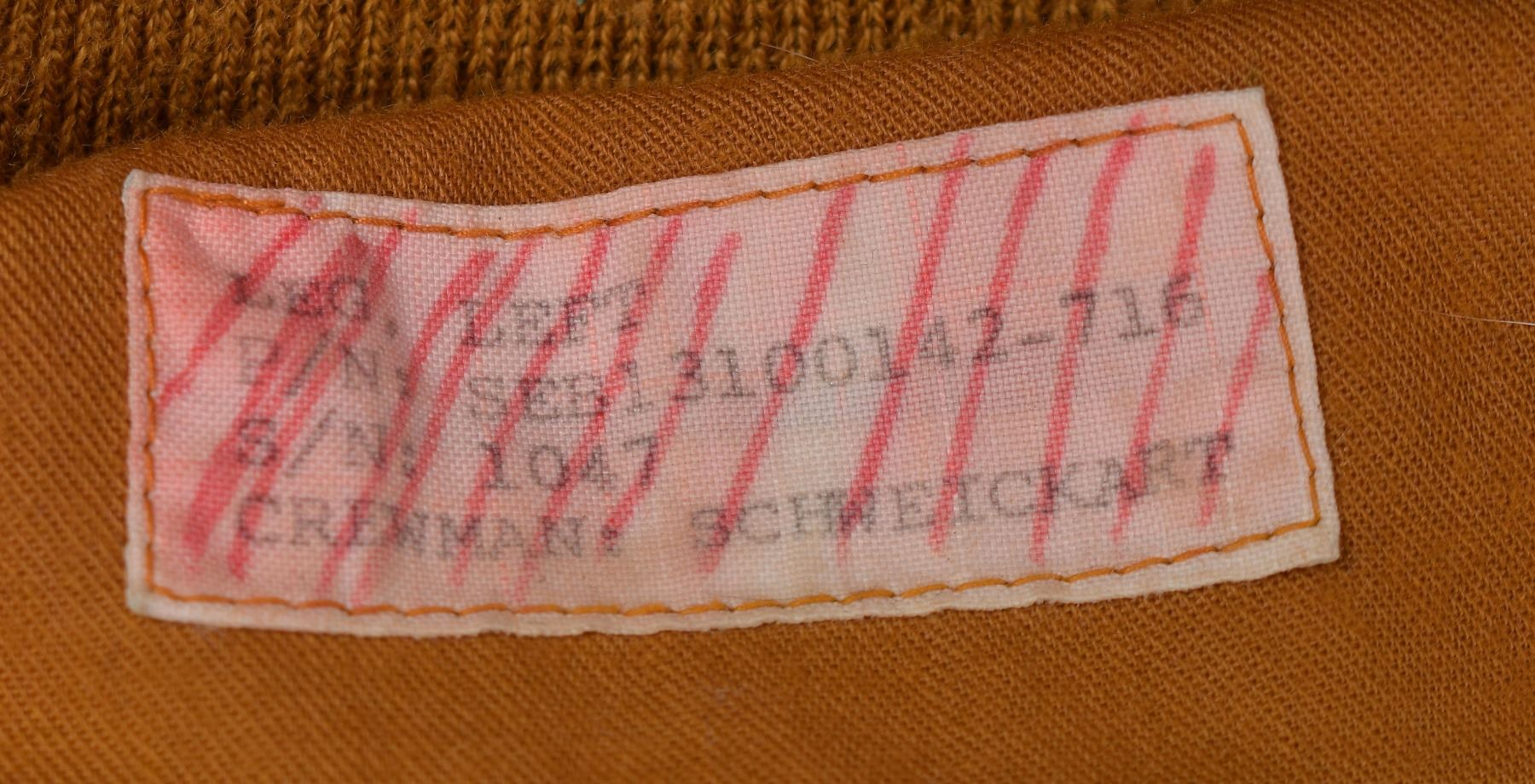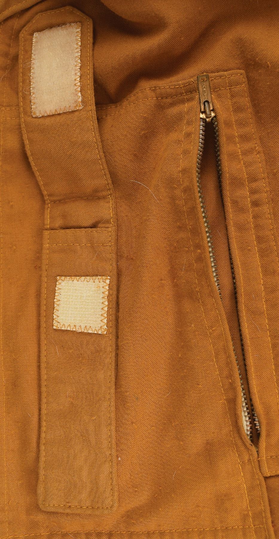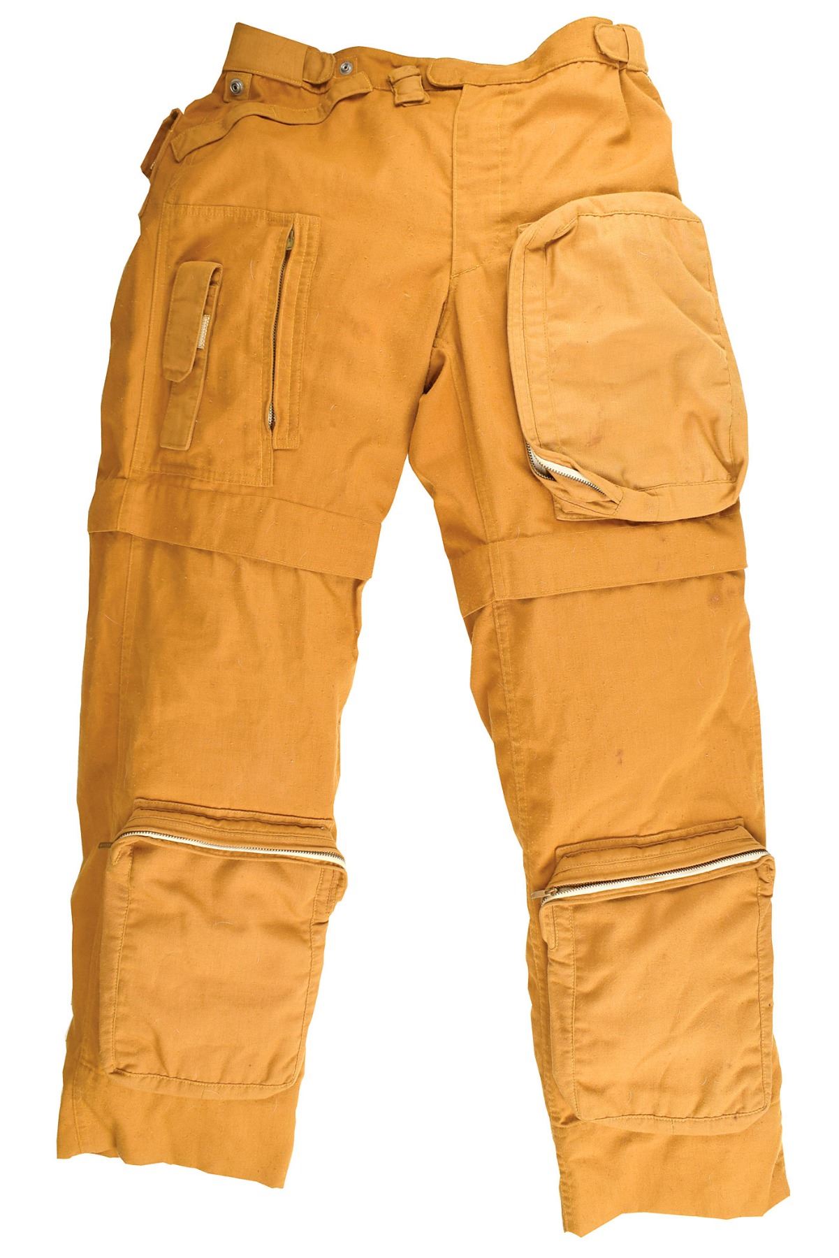 Impressive pair of gold-colored trousers made for astronaut Rusty Schweickart during training exercises for the Skylab 2 mission at the Lyndon B. Johnson Space Center in Houston, Texas. The trousers are made of woven Durette material and feature metal snaps and Velcro belt cinches to waist and pockets, zippers to front, side and cargo pockets, and removable lower pant sections; the manufacturing tags to inner waist, which have been crossed over in red felt tip, are marked as follows: “Trouser Assy, P/N: SEB13100142–301 (302), S/N: 1047, Crewman: Schweickart, Contract No: NAS9–8309, Date of Mfg: 4–7–72, Mfg By: Welson & Co, Inc.” and “Shorts, P/N: SEB13100142–718 (721), S/N: 1047, Crewman: Schweickart.” In fine condition, with expected wear from use.