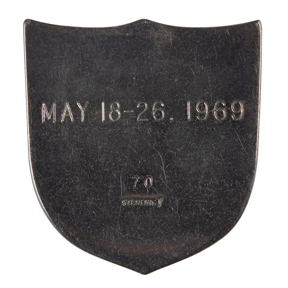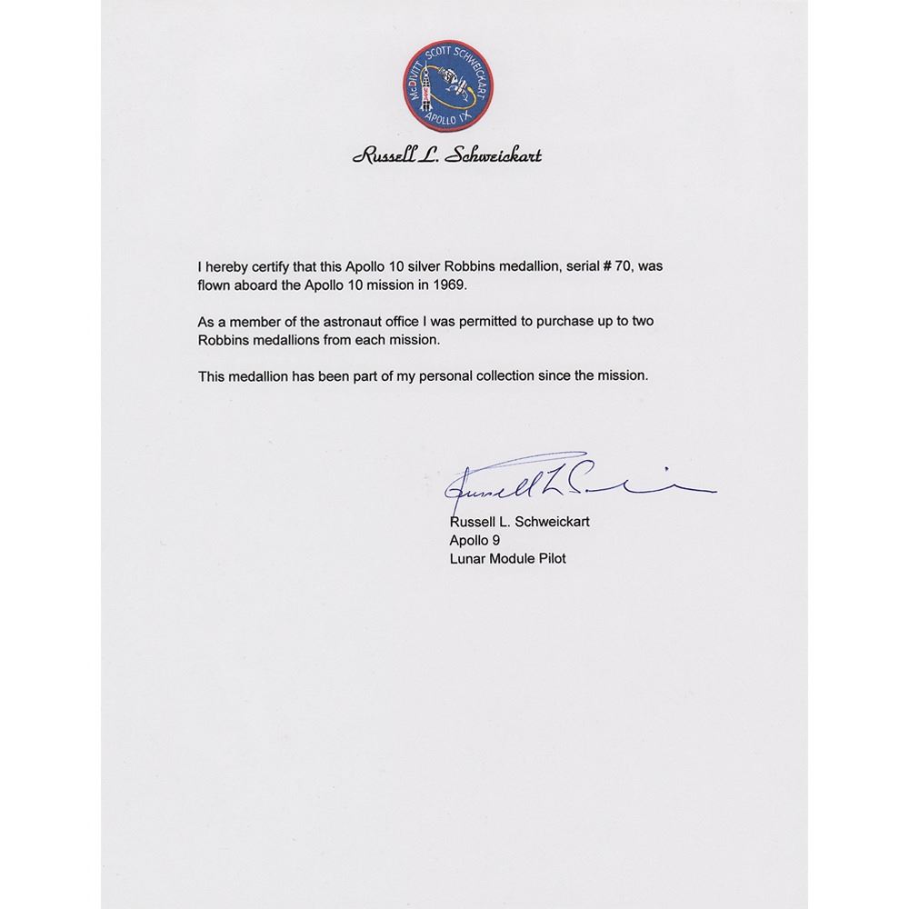 Rusty Schweickart's flown sterling silver Apollo 10 Robbins medallion, measuring approximately 1.25˝ x 1.25˝, featuring a raised design of the shield-shaped mission insignia on the face—a Roman numeral "X" towering over the lunar surface, with the CM and LM on orbit, with the crew's surnames in the border: "Stafford, Young, Cernan." The reverse is engraved with the mission dates, "May 18–26, 1969," and serial number, "70." Stamped below with the Robbins "Sterling" hallmark. Encapsulated and graded by NGC as "MS 65," with the label noting the provenance, "Ex. Rusty Schweickart." Accompanied by the original case and a letter of provenance from Schweickart, in part: "I hereby certify that this Apollo 10 silver Robbins medallion, serial #70, was flown aboard the Apollo 10 mission in 1969. As a member of the astronaut office, I was permitted to purchase up to two Robbins medallions from each mission."