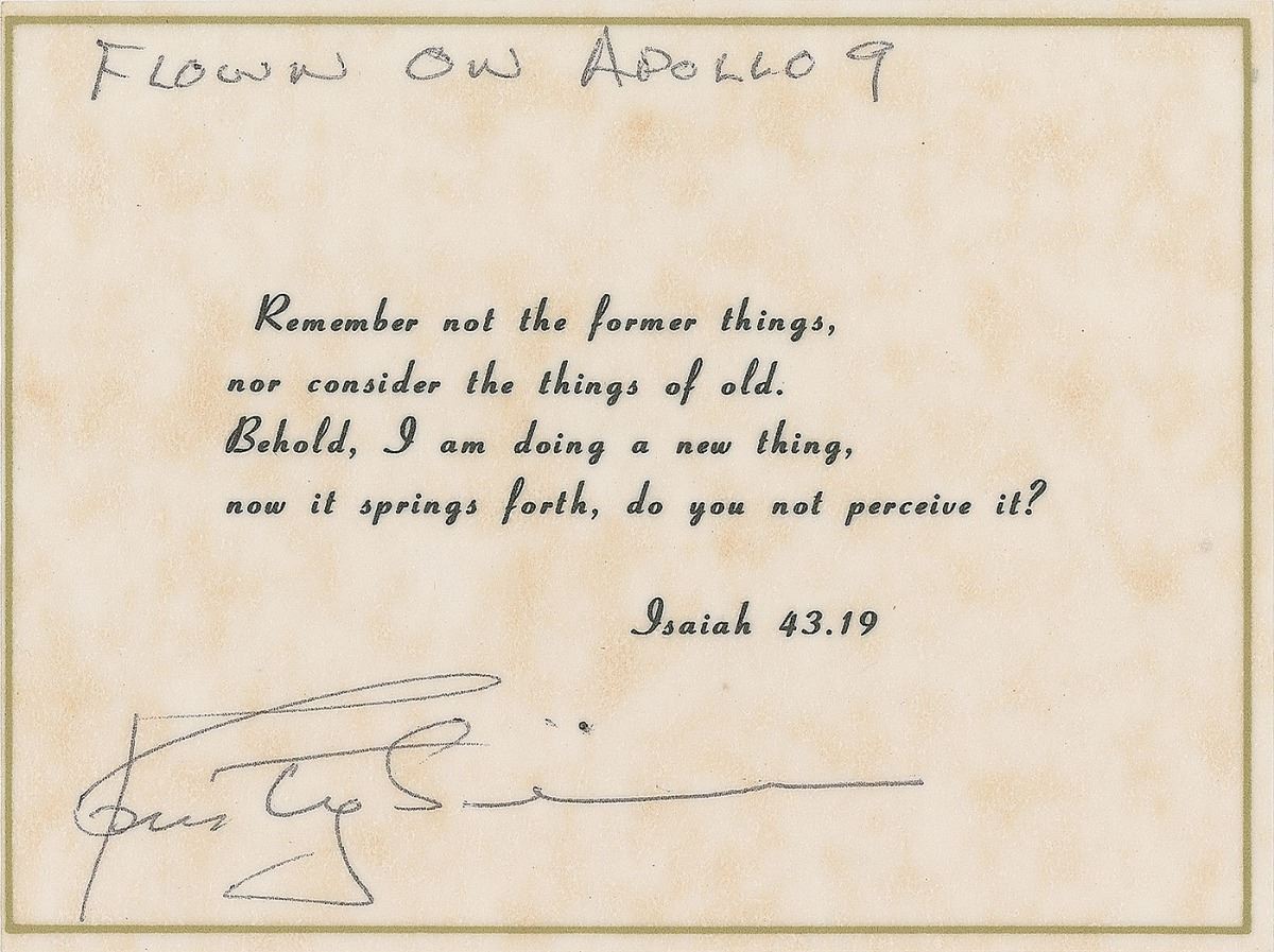 Flown printed quote on an off-white 4 x 3 sheet, signed and flight-certified in black ballpoint, “Flown on Apollo 9,” and below, “Rusty Schweickart.” In full: “Remember not the former things, nor consider the things of old. Behold, I am doing a new thing, now it springs forth, do you not perceive it? Isaiah 43.19.” In fine condition.