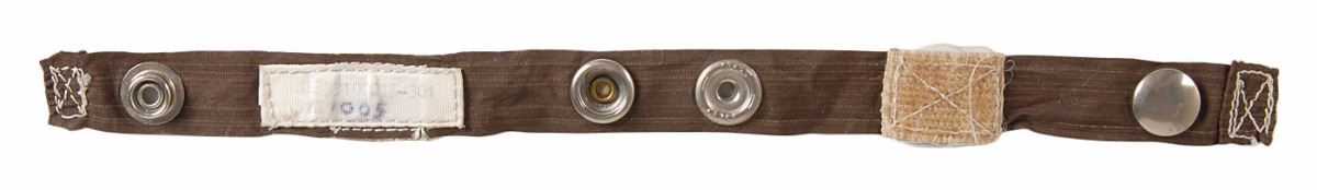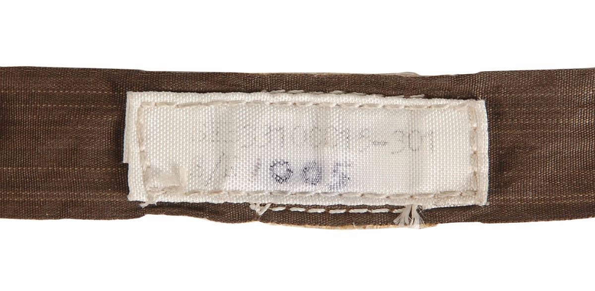 Rusty Schweickart’s flown interim stowage strap, 10.5? in length, carried aboard the lunar module Spider during the Apollo 9 mission. The strap features two Velcro swatches, two buttons with adjacent snaps, and an identification label, “SEB33100015–301, S/N 1005.” In fine condition. Accompanied by a signed letter of authenticity from Schweickart, in part: “I hereby certify that this accompanying interim stowage strap…was flown with me on the first flight of the lunar module on Apollo 9 in March, 1969. The item has been part of my personal collection since the mission.”