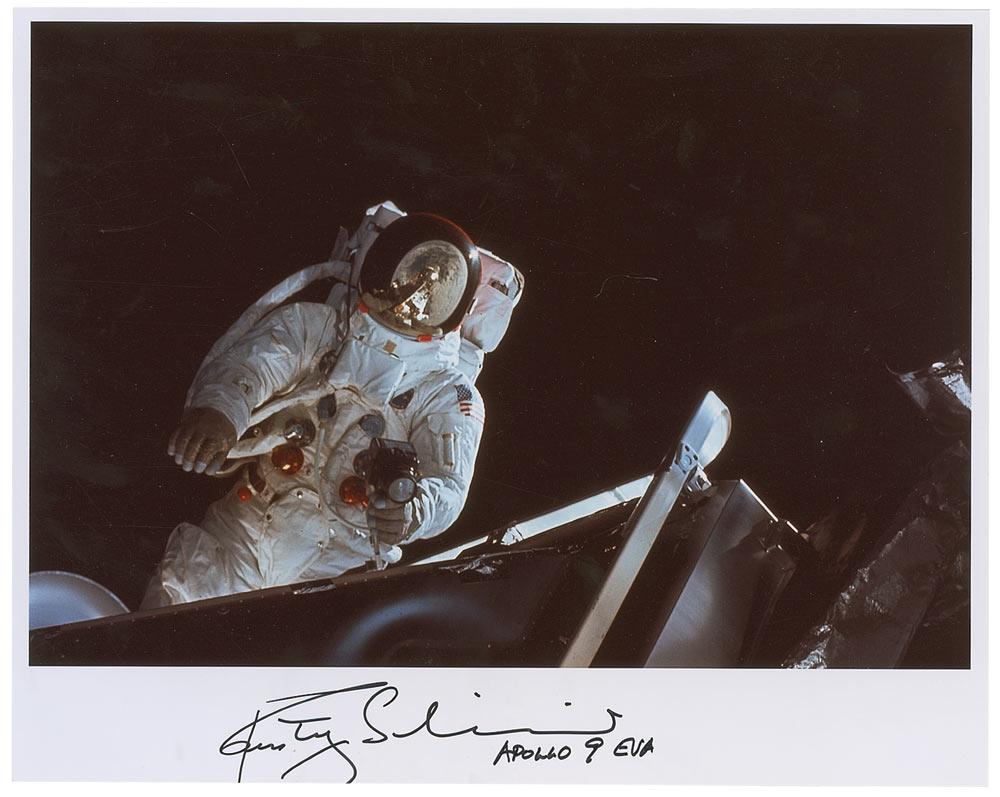 Color satin-finish 10 x 8 photo of Schweickart conducting his spacewalk, signed in black felt tip “Rusty Schweickart, Apollo 9 EVA.” In fine condition.