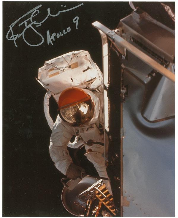 Color satin-finish 8 x 10 photo of Schweickart performing a moonwalk, signed in silver ink, “Rusty Schweickart, Apollo 9.” In very fine condition.