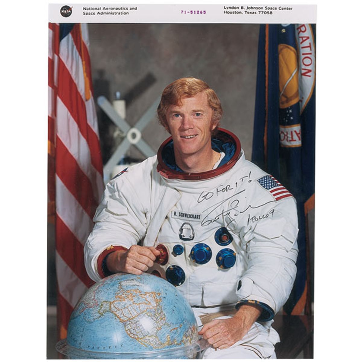 Color glossy 8 x 10.5 photo of Schweickart in his spacesuit, signed in black felt tip, “Go for it! Rusty Schweickart, Apollo 9.” In fine condition.