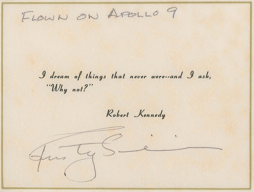 Flown printed quote, carried on board Apollo 9, on an off-white 4 x 3 slip. Quote, originally from Robert Kennedy, reads, “I dream of things that never were–and I ask ‘Why not?’” Signed in ballpoint, “Flown on Apollo 9, Rusty Schweickart.” In fine condition.