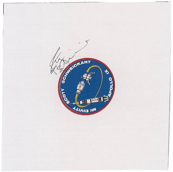 A 9 x 9 swatch of Beta cloth, bearing a printed 3? diameter Apollo 9 mission emblem, signed in black ink by Schweickart. In fine condition.