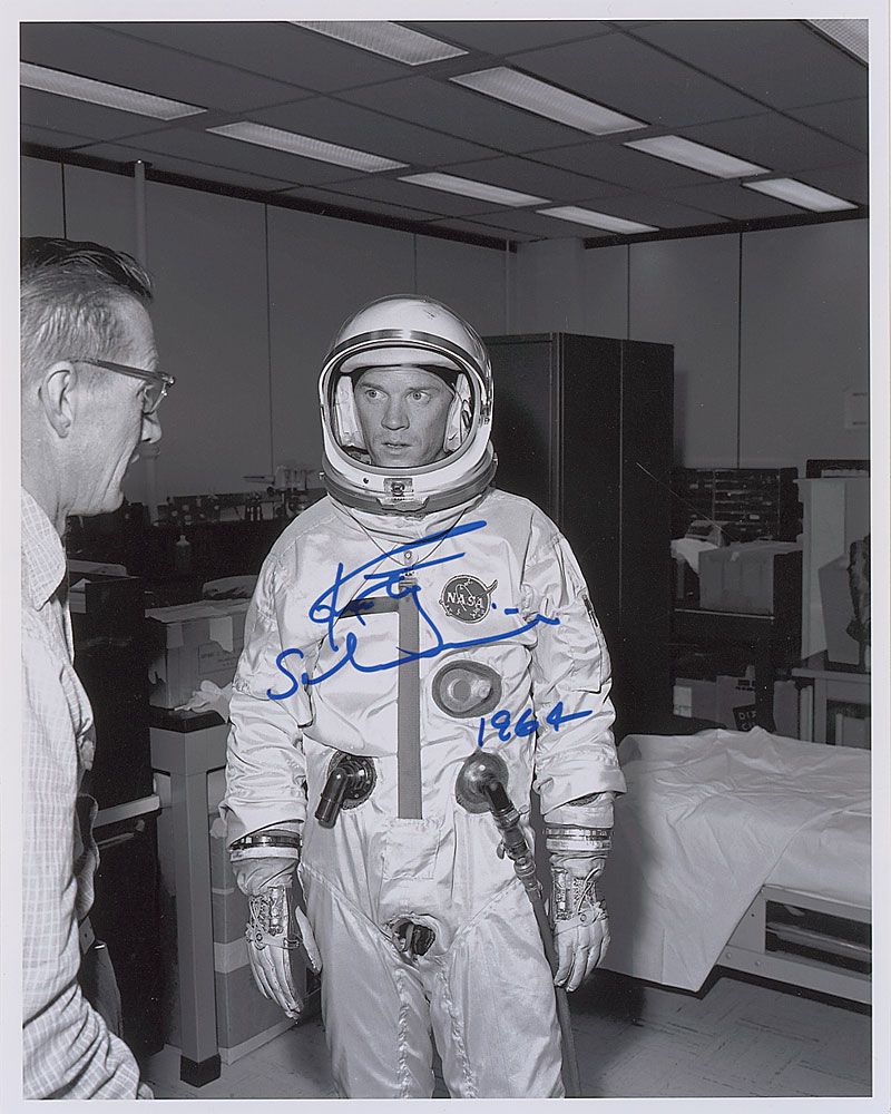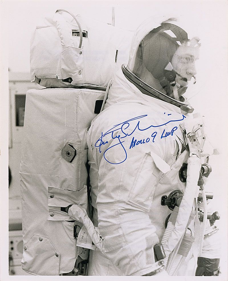 Two photos: one glossy 8 x 10 NASA photo of Schweickart wearing his extravehicular mobility unit, signed in blue felt tip, “Rusty Schweickart, Apollo 9 LMP”; and one satin-finish 8 x 10 photo of Schweickart in his space suit, signed in blue felt tip, “Rusty Schweickart, 1964.” In overall fine condition.