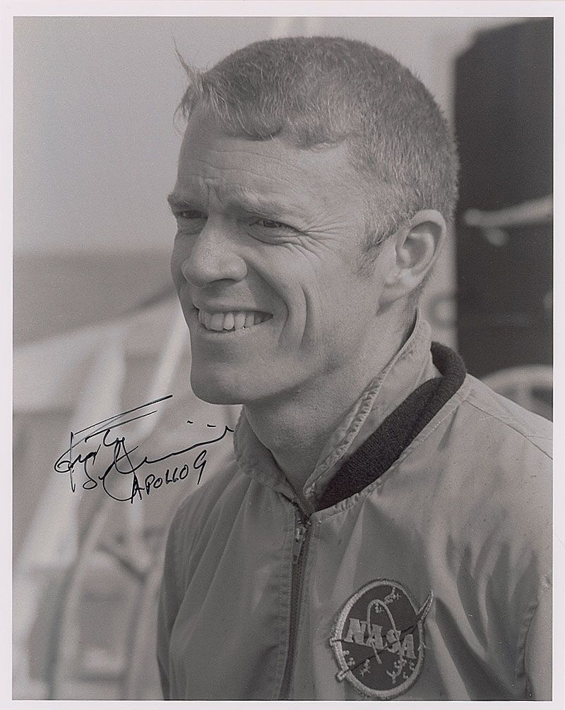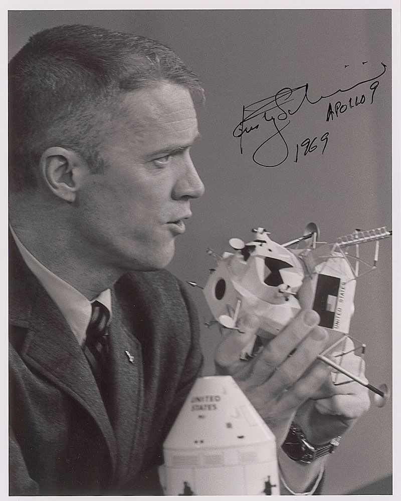 Two satin-finish 8 x 10 photos of Schweickart during the Apollo 9 mission, each signed in black felt tip, with Schweickart adding his mission to both. In very fine condition.