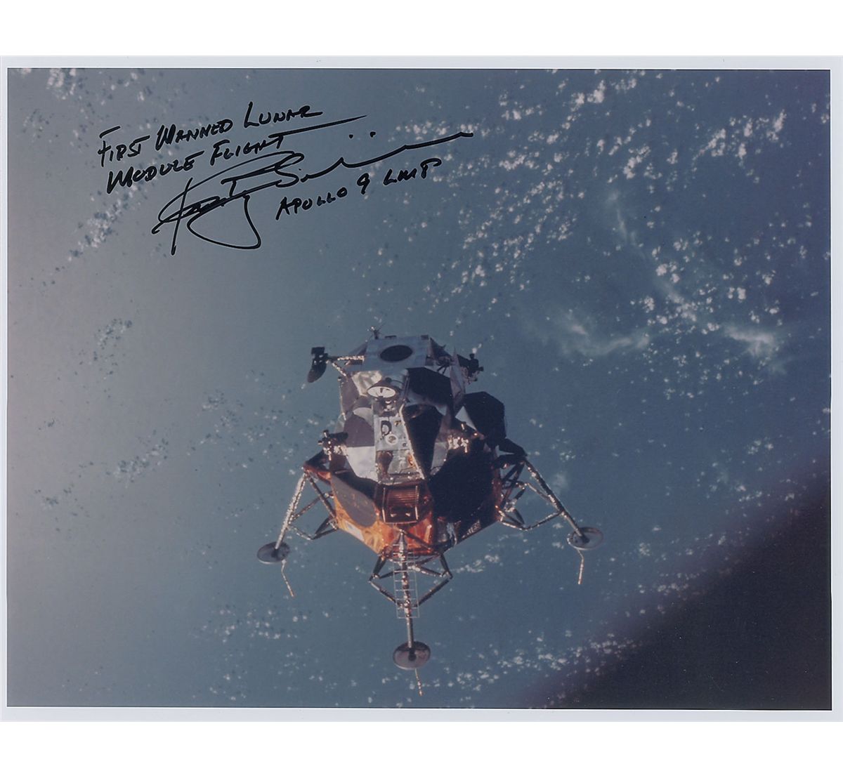 Color glossy 14 x 11 photo of the LM in orbit, signed in black felt tip, “First Manned Lunar Module Flight, Rusty Schweickart, Apollo 9 LMP.” In very fine condition.