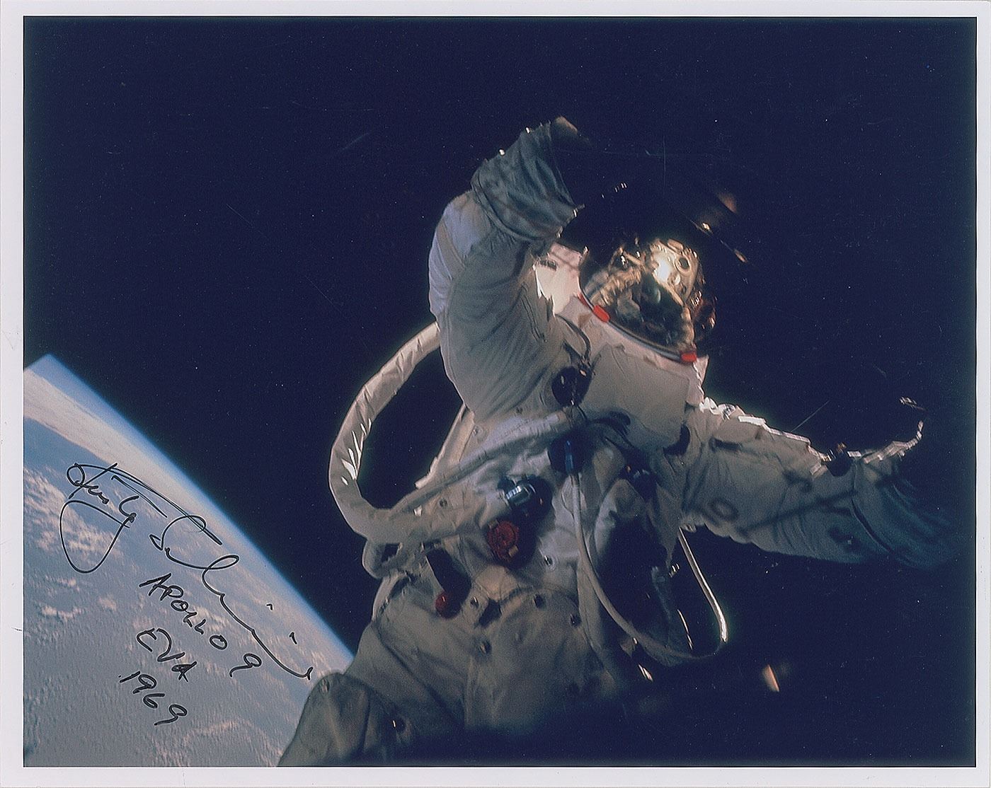 Color satin-finish 10 x 8 photo of Schweickart testing out the new Apollo spacesuit, the first to have its own life support system, during an Apollo 9 EVA, signed in black felt tip, "Rusty Schweickart, Apollo 9, EVA, 1969." In very fine condition.