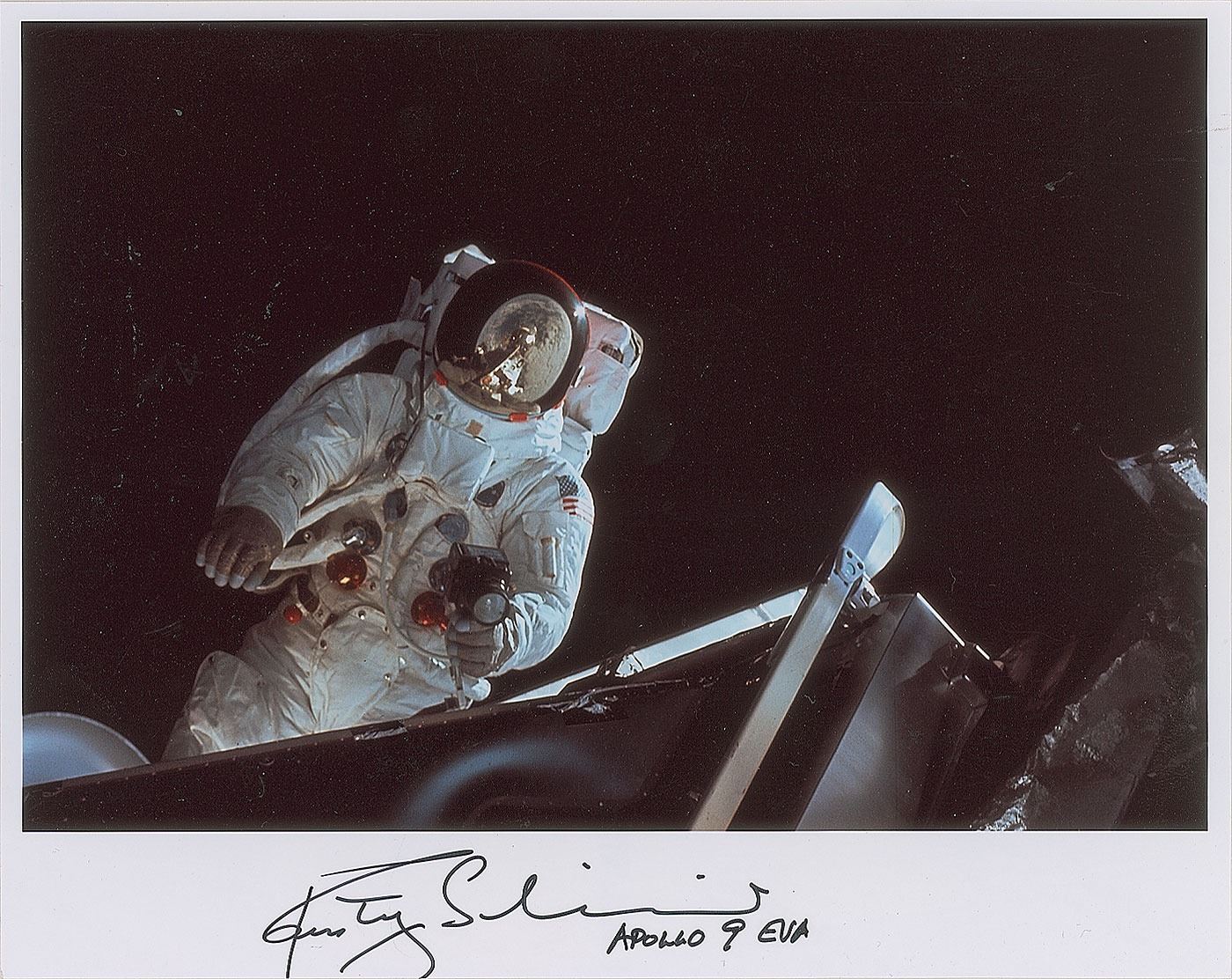 Color satin-finish 10 x 8 photo of Lunar Module Pilot Schweickart performing an EVA during the Apollo 9 mission, his helmet showing a reflection of the moon, signed in the lower border in black felt tip, "Rusty Schweickart, Apollo 9 EVA." In fine condition.