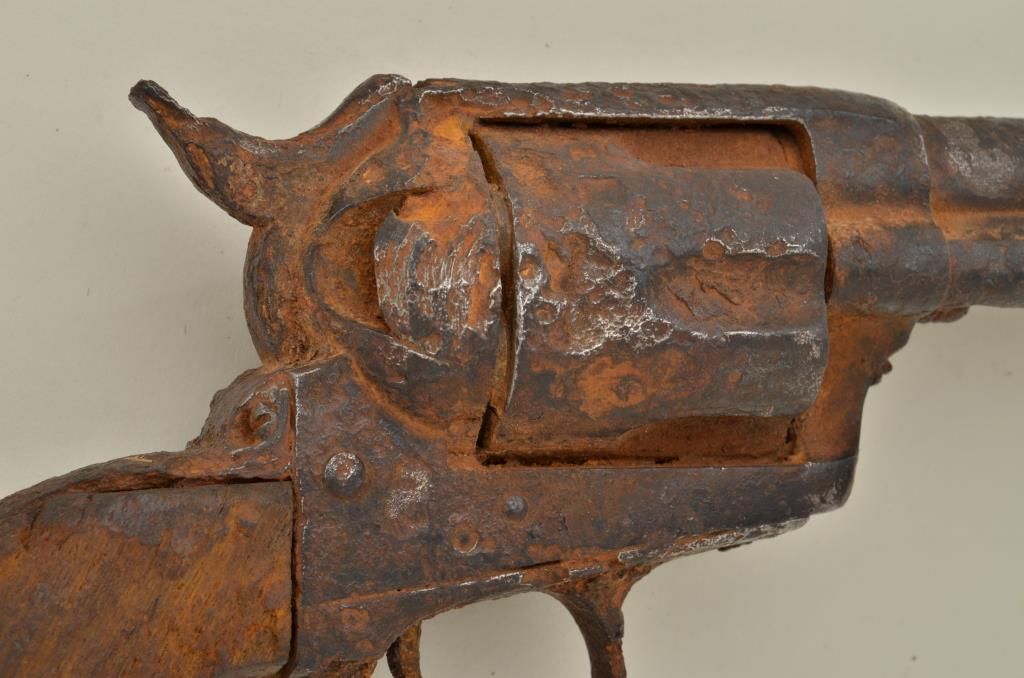 Rusty and relic condition Colt Single Action Army revolver complete with grips and loaded showing period shortened barrel to 4 ¾”, serial number 60090 originally displayed in Lyons Pony Express Museum collection located in Arcadia, California. A very old handmade wood display case that has had the lid removed shows a cardboard label upon which is written in fountain pen “This badly pitted Colt Frontier revolver has killed 8 men – and once was carried by Jesse James famous killer – Jesse James while pursued by officers – while swimming his horse across the Missouri River accidentally dropped this gun in the water 20 years afterward the river changed its course & this pistol was picked up on the bank still loaded but was rusted like hell Oil it up and it will shoot, from The Pony Express Museum – Arcadia, California”. This relic single action has been known by Southern California collectors for more than 50 years and by tradition it was gifted by William Lyon to a close personal friend in the 1950s who inscribed the card and kept it till in sold to Gale Kennedy by Reata Pass Gallery near Prescott, Az. Gale Kennedy historical West collection. Est.: $2,500-$5,000.