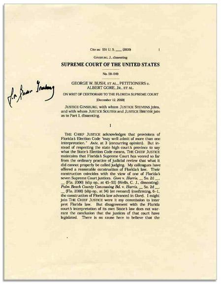 Signed copy of U.S. Supreme Court Justice Ruth Bader Ginsburg's opinion in the Presidential Election case issued on 12 December 2000 (George W. Bush vs. Albert Gore, Jr.). Justice Ginsburg signs boldly on the title page. Signed opinion runs 10 pages. A historic item relating to the closest Presidential election in U.S. history, in fine condition.