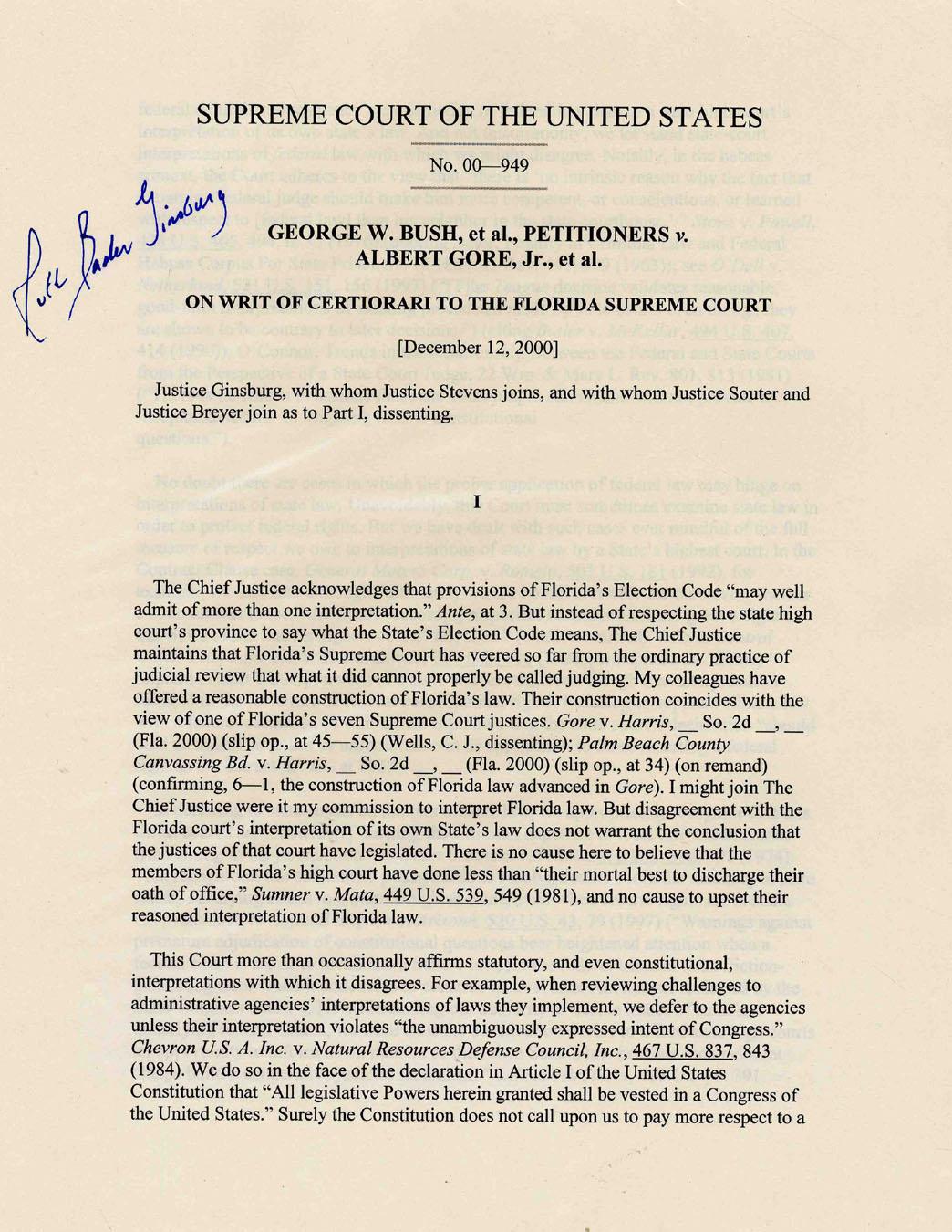 A printed copy of U.S. Supreme Court Justice Ruth Bader Ginsburg's opinion in the U.S. Presidential Election case issued on 12 December 2000 (George W. Bush vs. Albert Gore, Jr.). Document signed opinion is 10 pages printed on white 24 lb. paper, stapled together at the top left. Justice Ginsburg signs boldly on the title page. A historic item relating to the closest Presidential election in U.S. history, in fine condition.