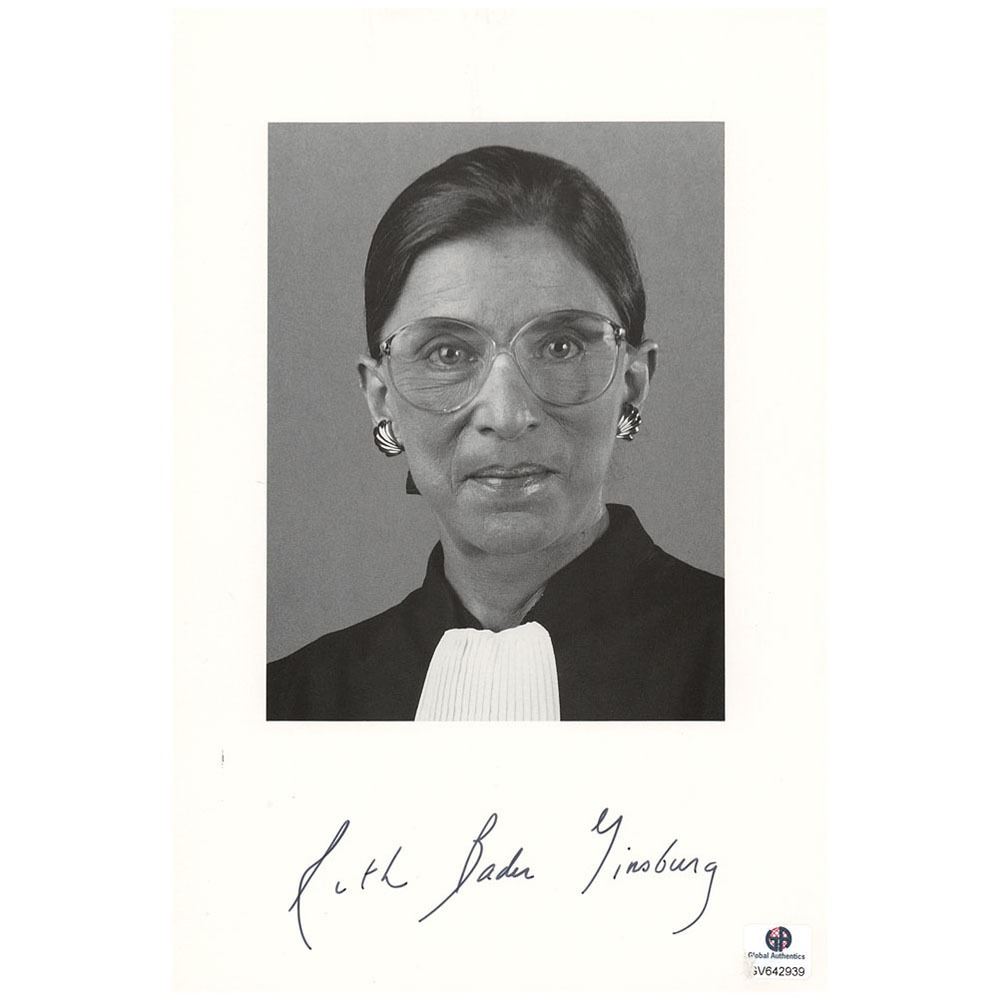 Semi-glossy 6 x 9 paperstock photo of Ruth Bader Ginsburg in her judicial robe, signed in the lower border in black felt tip. In fine condition, with a few small surface creases and an old label to the lower corner.