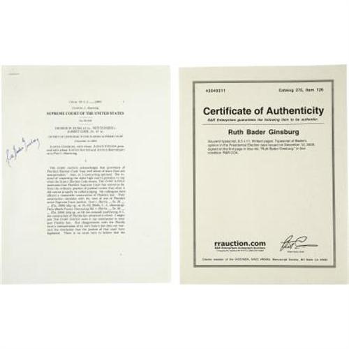 <B>Ruth Bader Ginsburg Souvenir Typescript of Her Opinion in the 2000 Presidential Election Case Signed</B></I> "<I>Ruth Bader Ginsburg</B></I>". Thirteen pages, 8.5" x 11", dated December 12, 2000, signed in blue ink, fine condition. Offered with a COA from R & R Enterprises Autograph Auctions.<BR><BR><BR><b>Shipping:</b> Flat Material, Small (<a target="_blank" href="http://www.heritageauctions.com/common/shipping.php">view shipping information</a>)