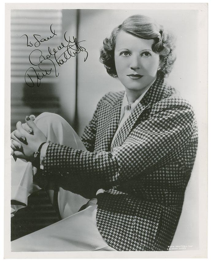 Vintage glossy 8 x 10 casual photo, signed and inscribed in-person in fountain pen “To Saul, Cordially, Ruth Chatterton.” Reverse of photo bears collector’s stamp date of April 27, 1939, the date the signature was acquired. In fine condition, with a few scattered light creases and surface marks. Saul Goodman Collection.