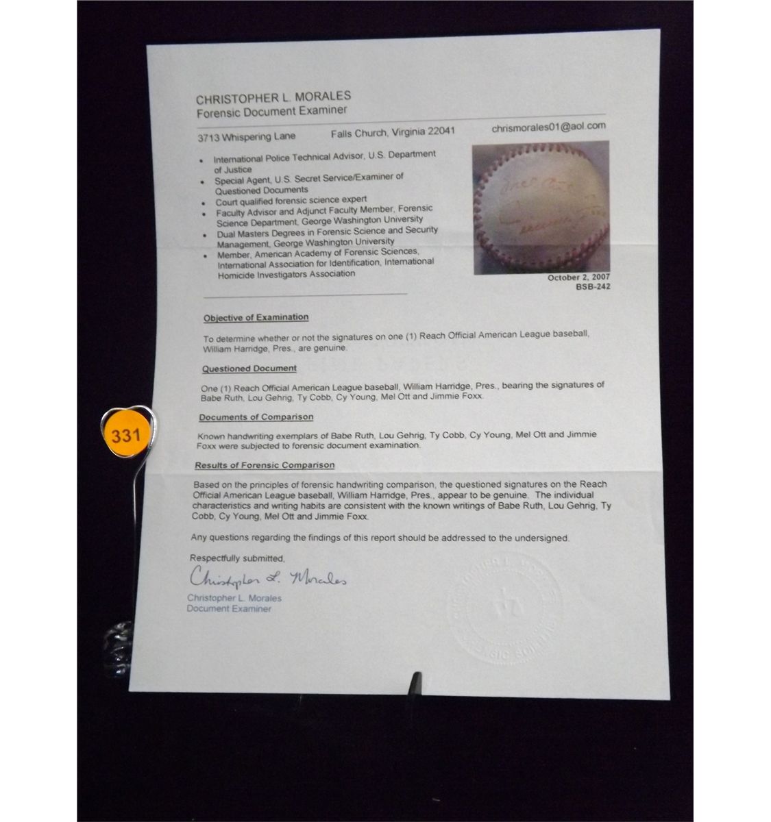 Ruth, Cobb, Gehrig, Young, Ott & Foxx Autographed HoF Baseball. Official Reach ALB Autographed by Babe Ruth, Ty Cobb, Lou Gehrig, Cy Young, Mel Ott & Jimmie Foxx. Appraised or estimated retail value $100,000. COA by Christopher Morales. All Sales Final. Please see terms and conditions of auction.