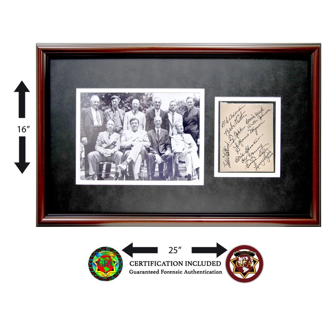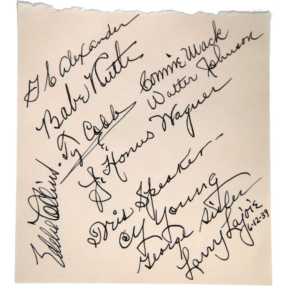 Baseball Hall of Fame (1939–Present). Babe Ruth, Ty Cobb, Honus Wagner and Cy Young signed Hall of Fame Induction Sheet. All four signed signatures are in black ink, the signatures are clean and clear and are as crisp as the day they were signed. The Hall of Fame was established in 1939 by Stephen Carlton Clark, an heir to the Singer Sewing Machine fortune. Clark sought to bring tourists to a city hurt by the Great Depression, which reduced the local tourist trade, and Prohibition, which devastated the local hops industry. Clark constructed the Hall of Fame's building, and it was dedicated on June12, 1939. (His granddaughter, Jane Forbes Clark, is the current chairman of the Board of Directors). Comes with a Letter of Certification from Autograph Certification Experts (ACE).