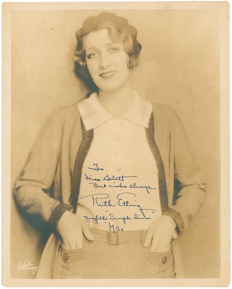 Popular American singer of the 1920s. Vintage sepia matte-finish 8 x 10 photo, signed and inscribed in fountain pen “To Miss Gelett, Best wishes always, Ruth Etting, Ziegfeld’s ‘Simple Simon’ 1930.” Creasing to left corners, some stray pencil marks, and some silvering to darker areas of image, otherwise fine condition.
