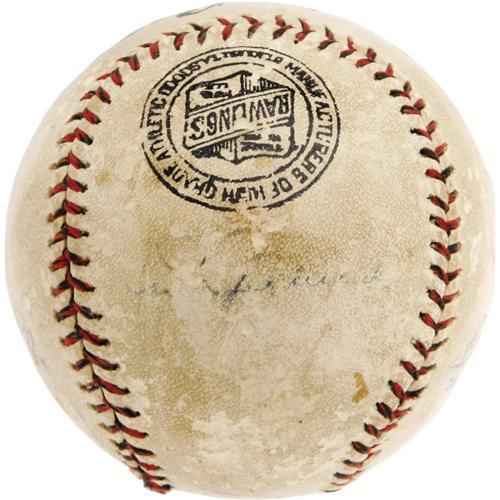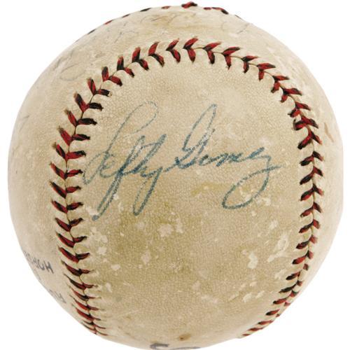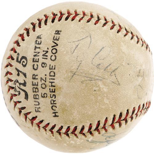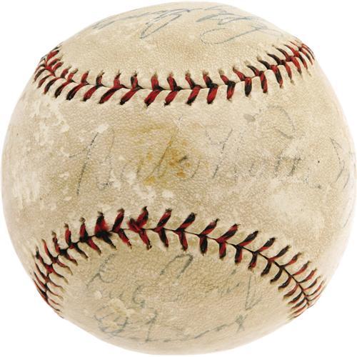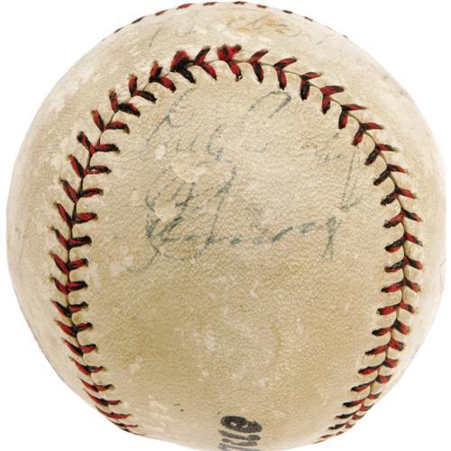 <B>1920's Ruth, Gehrig, Cobb, Pennock & Combs Signed Baseball.</B></I> Not a bad bunch of names, is it? One savvy fan of Golden Age baseball resisted the temptation to hand this "State League" ball over to just anybody with a glove or a bat, seeking out the cream of the crop instead. Now a lucky bidder will become the beneficiary of this fan's wisdom, as we're able to present this most exclusive of signed spheres on the auction block. Taking up his permanent sweet spot residence is the Babe (5/10) himself, with Lou Gehrig (3/10) on the panel to his left and Ty Cobb (7/10) to his right. Lefty Gomez (9/10) above is the strongest of the bunch, with Earle Combs (4/10) and Herb Pennock (5/10) downstairs. The ball shows a fair amount of surface wear, but our catalog photography should illustrate that the effects are not that dramatic. Five playing-days 1920's Hall of Famers for the price of one! <I>LOA from PSA/DNA.</B></I>