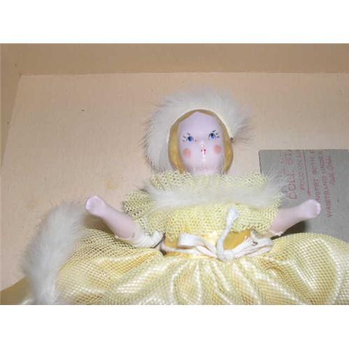 Ruth Gibbs 7" China Doll. She is the pink china. She is January and has her box with the label and her paper label in the back of her dress. She has her headpiece glued to her head. She has a pretty blonde color hair and large blue eyes. She has check coloring and very expressive eyelashes. She has a white cloth body. She has gold painted shoes. She was made in the 1950's. A small piece of one corner of the box lid is torn off. The label says No. 501P January Play Friend. She's from a smoke free environment. Buyer to pay $15 for shipping, insurance and handling.