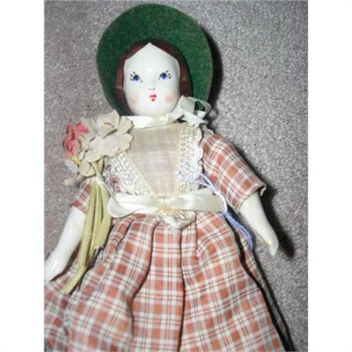 </font></strong>This is a 7" Ruth Gibbs china doll. She was produced by Ruth Gibbs, in Flemington, N.J. This doll is a white china with brown painted hair and brown shoes. This body is is a white cotton material. This doll is Meg from the Little Women Series. She has her bouquet of flowers tied to her arm. She has an attached net slip and matching pantaloons. The white is yellowed and the front of the dress is a lighter color than the back so there is fade. She still looks good. The hat is green felt and ties with white ribbon. The dress is pinned in the back. On the back of the shoulderplate it is marked RG. She has no holes, stains, or tears. No bad odor! She's in nice condition and appears to have never been played with. She is from a smoke free environment. If you can love her, please bid. Buyer to pay $10 for U.S. shipping, insurance, and handling. Thanks for viewing.</font>