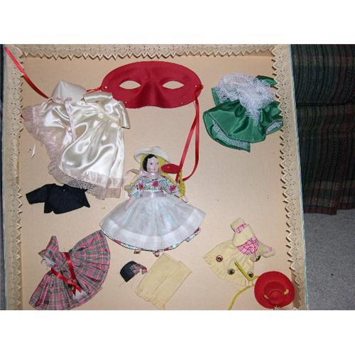 This is a wonderful set and very rare. It comes in the large box sized 18 1/2 X 18 1/2 X 3 1/2 approximately. There is paper laced edged border around the inside of the box. Some of the corners of the lid and along the side need to be taped. The doll is a 7" pink china with black painted hair and gold slippers. She has on her cotton print dress with pink net pantaloons and has a yellow yarn wig attached to the white felt hat. Shehas her red felt mask to match the little girl's red mask. She comes with 4 other outfits: cowgirl with hat, Scotch with jacket and hat, Irish with net mop cap, and a white satin dress with pink net trim and felt bonnet with matching pink net trim. What a wonderful find! These large sets are very hard to come by. I'm sure this one is extremely hard to come by as why wouldn't a little girl wanted to play with this! Set is from a smoke free environment. If you desire a layaway please contact me prior to bidding. Buyer to pay $20 for U.S. shipping, insurance, and handling. Thanks for viewing.
