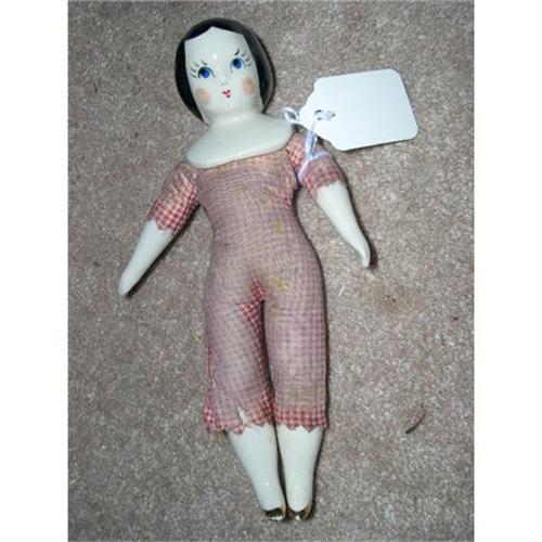 This is a Ruth Gibbs china doll made in the 1940's and 50's in Flemington, N.J. She is 7" tall and is made of white china. She has black painted hair and large blue eyes. She has the gold shoes. There is a little paint loss to the shoes. The body is soilded and not sure what happend. There is no smell. There is a split in the material at the top of one leg and you can see the cotton stuffed used in the body.The split is down the seam line so you could easily just whip it back together. Once dressed you wouldn't see the body and she would look great on your shelf. She is from a smoke free environment. If you can love her, please bid. Buyer to pay $8 for U.S. shipping, insurance, and handling. Thanks for viewing.