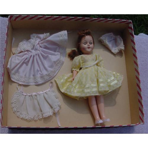 10" Ruth Gibbs hard plastic Miss Moppet Gift set, comes with doll and extra outfit. Doll has not been removed from box. Box has the #1104 on the end and the Miss Mippet label on the other side. Box has some fading and I see a slit on the lid.
