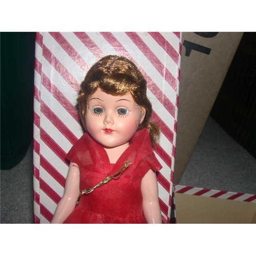 This doll is a Ruth Gibbs Miss Moppet hard plastic doll. (Ruth Gibbs also made china dolls in the 1940's and 1950's.) These may be dolls she bought from another company and put in her boxes. Three are gift sets with this same type doll that were available inthe 1950's with elaborate wardrobes. She is in her original red and white striped box. The label on the end of the box says Miss Moppet by Ruth Gibbs Flemington, New Jersey. The store tag says $1.98 and stamped is 100 on the box and someone has written in black the letter P. The doll has a brown wig still with the rubber band entwined in the bangs. Her blue eyes open and close. She has the protruding eyelashes and lower painted lashes. Her facial coloring is great. Her head, arms, and legs move. She may have been the basic doll with the panties as it appears the doll has nicely made homemade clothes. She has white painted slippers with bows. I think the feet were just dipped into a tray of white paint and the paint was not even. (This was typical of the mass production during the 50's.)There is a piece of paper in the box that is handwritten "Adah" Madeline Hylton 1954-55. I believe that this doll was probably dressed for her or by her during this time period.