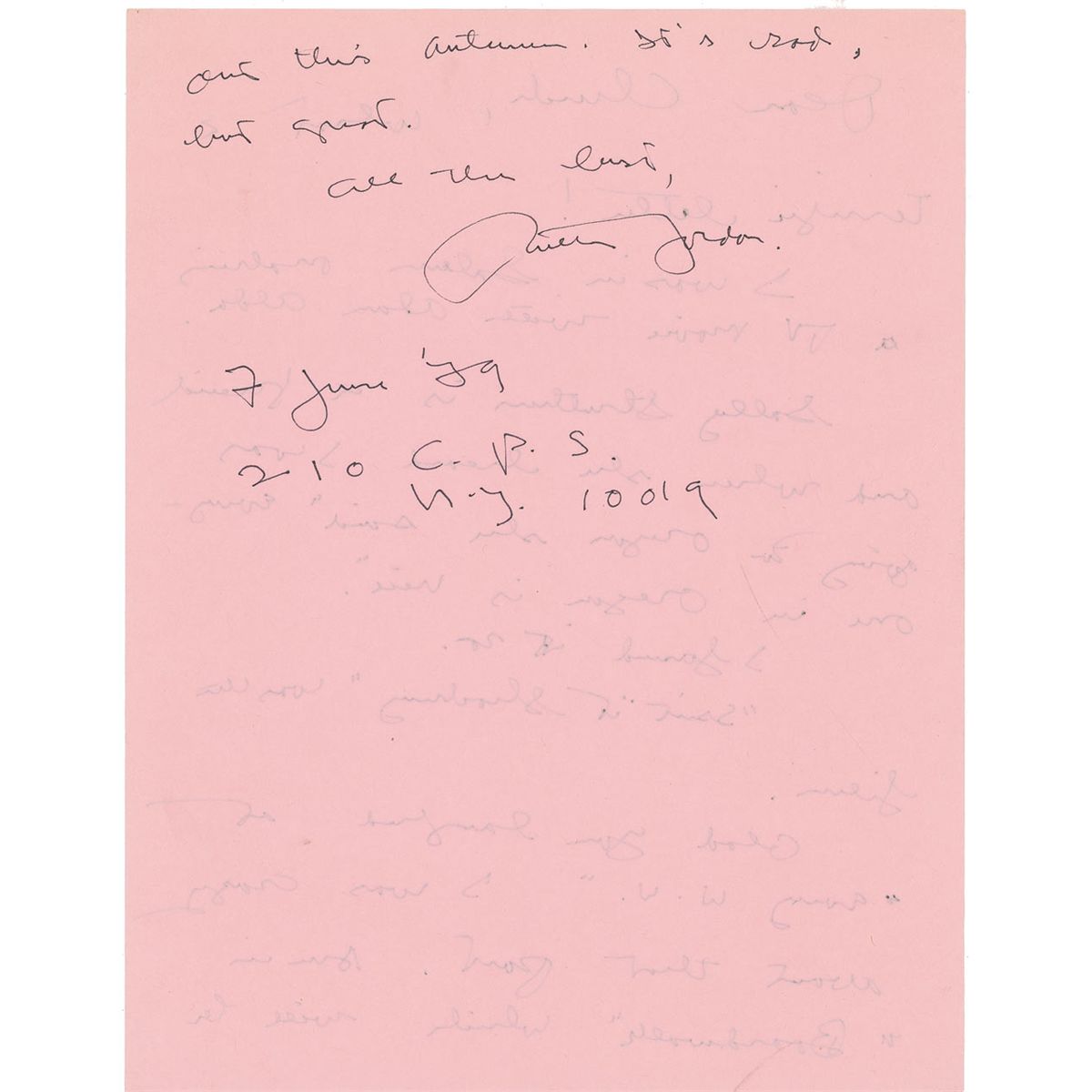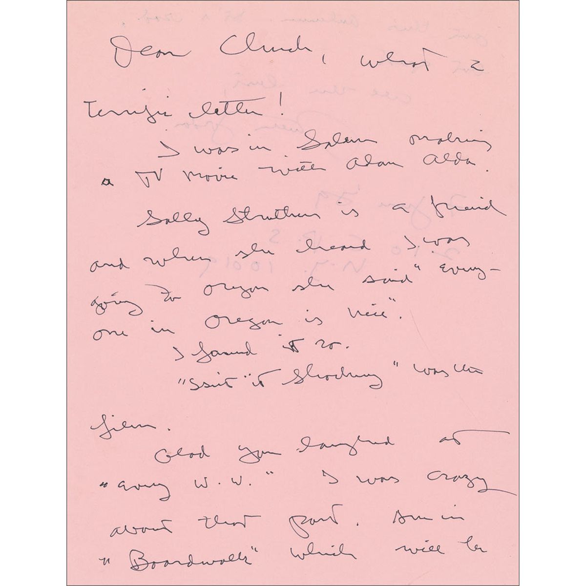 ALS, one page both sides, 8.5 x 11, June 7, 1979. Letter to a friend. In part: “I was in Salem making a TV movie with Alan Alda. Sally Struthers is a friend and when she heard I was going to Oregon she said ‘Everyone in Oregon is nice’…Glad you laughed at ‘Every W. W.’ I was crazy about that part.” In fine condition.