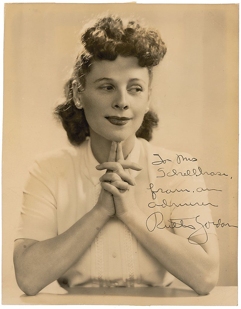 Vintage pearl-finish 7 x 9 promotional photo for Gordon’s play Over Twenty One, signed and inscribed in fountain pen, “To Mrs. Schellhase from an admirer, Ruth Gordon.” In fine condition, with slightly trimmed edges.