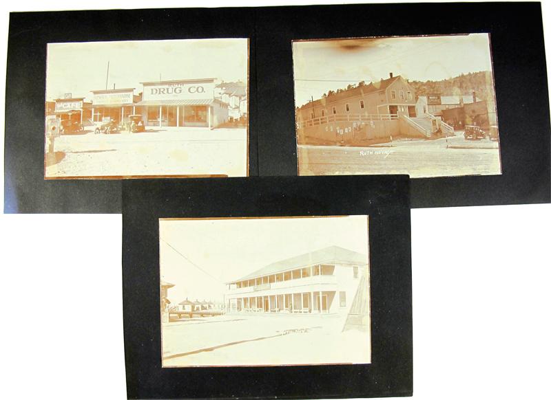 Three photographs on black matte measure at 6 ¾’’x 9 ¾’’. Focus is sharp, and medium contrast. Then photos have yellow age marks and wear on the edges. No photographer identified. The first is of three different business buildings. The first one “Ruth Drug Co.” The second “W.F. Squire General Merchandise Market and Grocery. And the last store “Ruth Café.” Three cars are parked in front of the stores; people are clearly seen seated in the vehicles. The second is of a large building next to a series of smaller buildings housing different stores. One titled “Hughes Store” with a smaller underneath that in partly covered up but the word “Furnishings” can be seen clearly. A smaller building on the right side “Goodman Tidball Merc Co. Three cars are present in front of the stores. The last is of the Star Pointer Hotel. It’s a large building with two people seated on the porch. Several small homes are seen in the distance and one has a parked car in front. Ruth is a town west of Ely. Home to several copper mines, this turn of the century mining town boomed until the Great Depression. At it’s peak population Ruth was home to over 2,200 people.