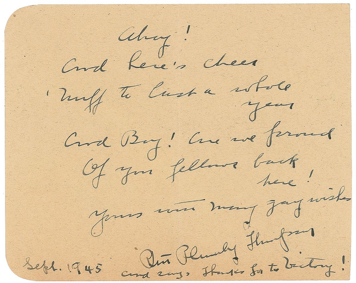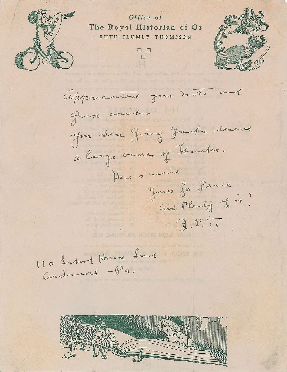 Children’s writer (1891–1976) best known for her stories set in Oz. Letter and poem sent to an American serviceman during World War II: an ALS signed “R. P. T.,” one page, 8.5 x 11, The Royal Historian of Oz letterhead, no date, in full: “Appreciate your note and good wishes. You sea going Yanks deserve a large order of thanks. Here’s mine. Yours for peace, and plenty of it!”; and a handwritten poem on a 5.5 x 4.5 album page, “Ahoy! And here’s cheer ’nuff to last a whole year, And Boy! Are we proud of you fellows back here! Yours with many gay wishes, Ruth Plumly Thompson, and say, thanks for the Victory!” In overall fine condition, with some light creasing and wrinkling to the letter.