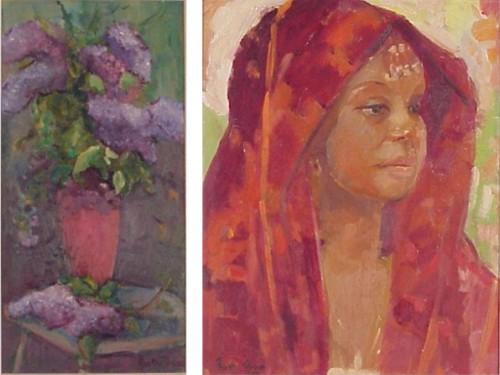 MAIDEN IN RED VEIL, oil painting on canvas, 20 x 16”, signed lower left, framed, surface soiling; LILACS, oil painting on canvas, 36 x 18”, signed lower right, framed, chip bottom center, chip and crackling bottom center left. (2) $100/200