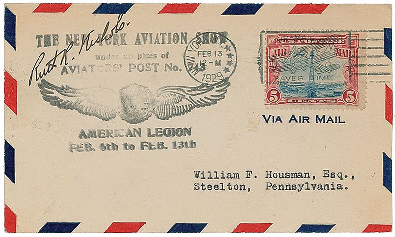 Aviatrix (1901–1960) who was the only woman yet to hold simultaneous world records for speed, altitude, and distance. Commemorative cover with a stamped cachet for the New York Aviation Show, signed in black ink, “Ruth R. Martin.” In fine condition, with a couple trivial spots and a typed address to lower right.