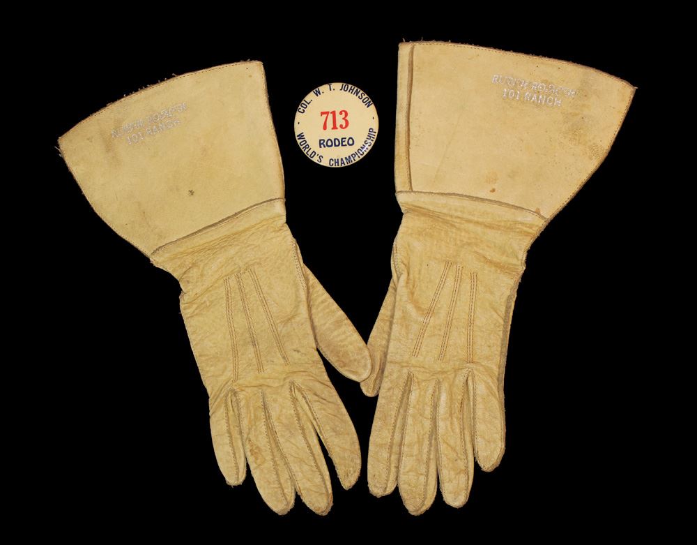 Nice leather cowgirl gauntlets with embossed cuffs to "Ruth Roach 101 Ranch". In lightly used condition. Accompanied by an interesting World's Championship Rodeo pin.