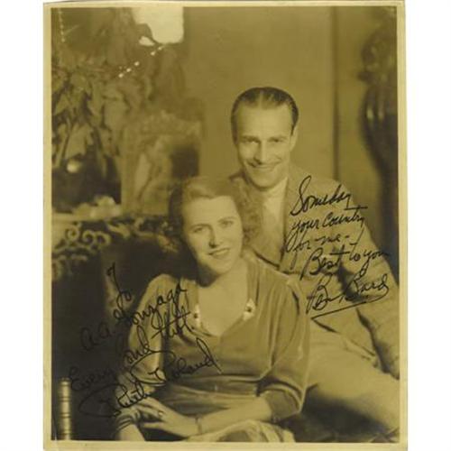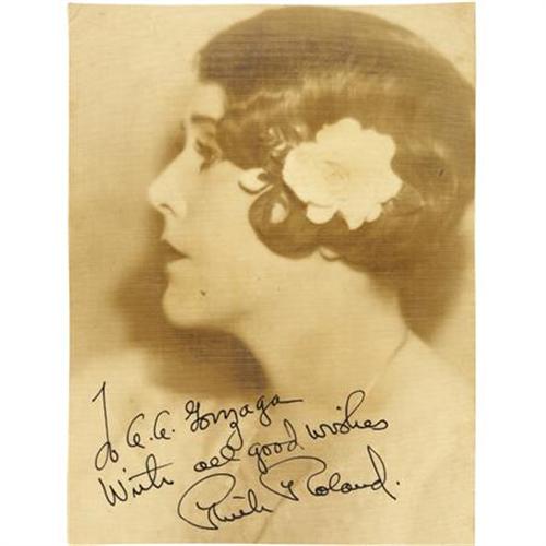 <B>Ruth Roland Autograph Group.</B></I> Ruth Roland (1892-1937) was known as "The Queen of the Thriller Serials," and here are three signed pictures of the silent-era damsel-in-distress: a 6.5" x 8.5" profile pose, signed in black ink; an 8" x 9.5" pretty smiling portrait in bonnet and signed in black ink; and a 7.5" x 9.5" portrait of Ruth with her husband, Ben Bard, signed and inscribed by both in black ink. Bard (1893-1974) was a respected Hollywood drama coach and an actor in such films as <I>The Leopard Man</B></I> and <I>The Seventh Victim.</B></I> There's are creases along the right top and side of the bonnet pose, and some damage on the reverse from scrapbook adhesive, otherwise Very Fine condition.<BR><BR><b>Shipping:</b> Flat Material, Small (<a target="_blank" href="http://www.heritageauctions.com/common/shipping.php">view shipping information</a>)