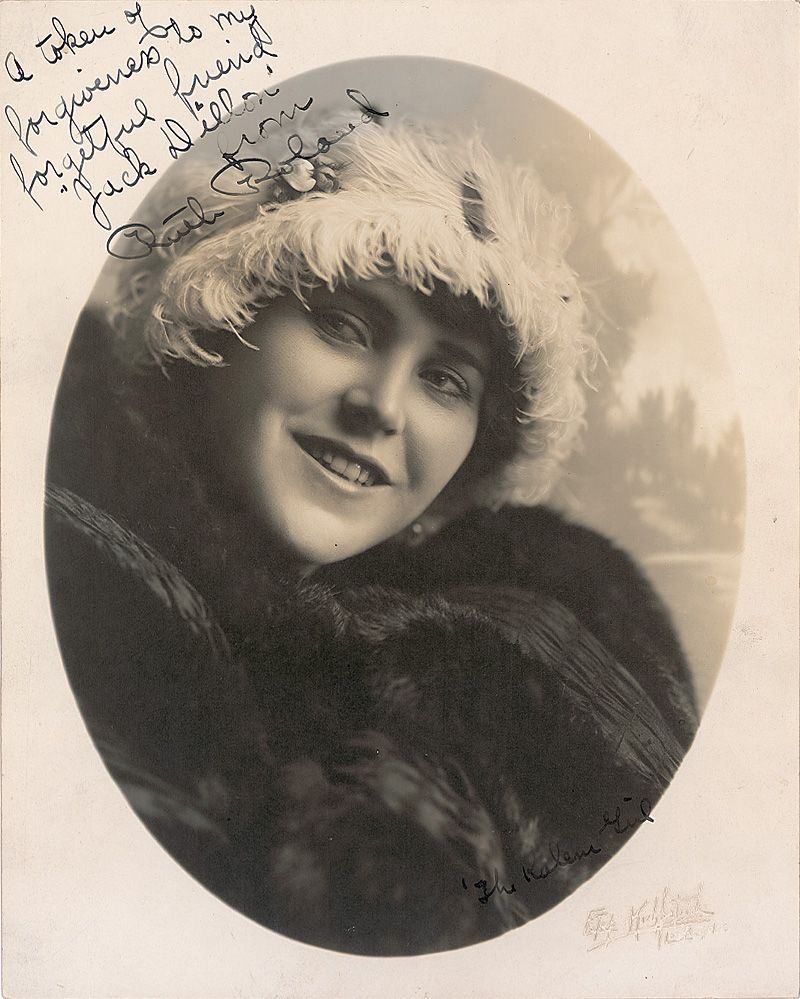 Vintage matte-finish 8 x 10 photo of Roland in fur and a fancy hat, signed and inscribed in fountain pen “A token of forgiveness to my forgetful friend ‘Jack Dillon,’ from Ruth Roland.” A notation at the bottom of the photo reads, “The Kalem Girl.” In fine condition, with a trivial central crease, scattered light impressions, and some irregular adhesion to the signature.