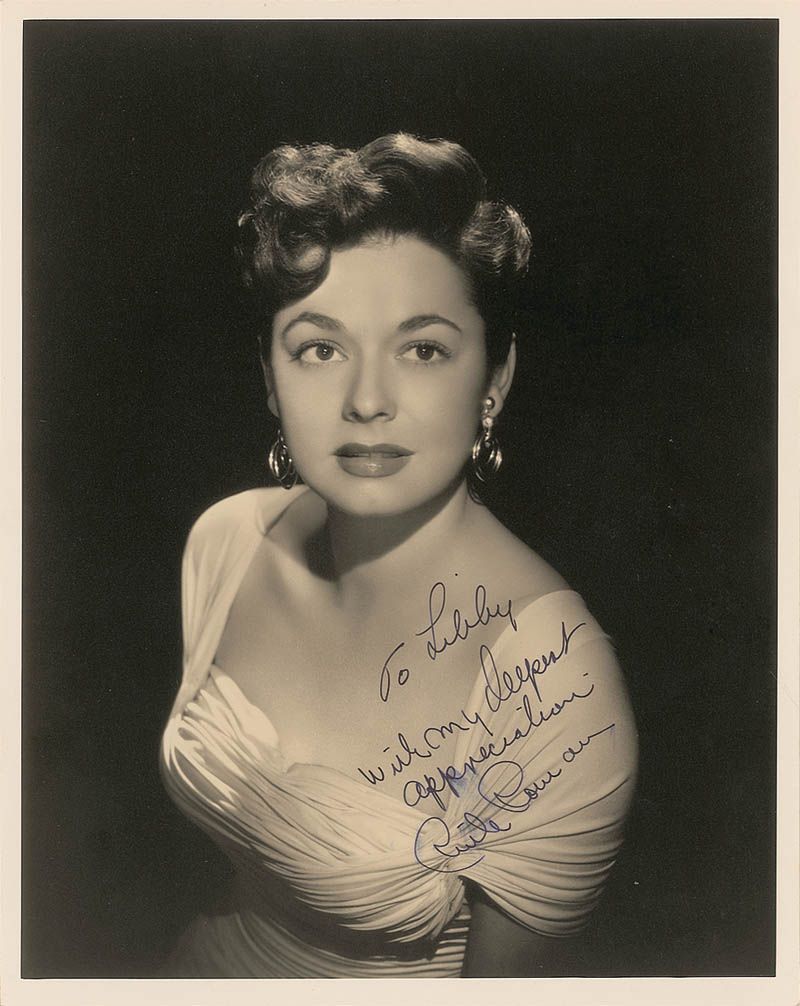 Pretty vintage matte-finish 8 x 10 photo of Roman in a classy dress, signed and inscribed in fountain pen “To Libby, with my deepest appreciation, Ruth Roman.” Some brushing to the sentiment and signature, otherwise fine condition.