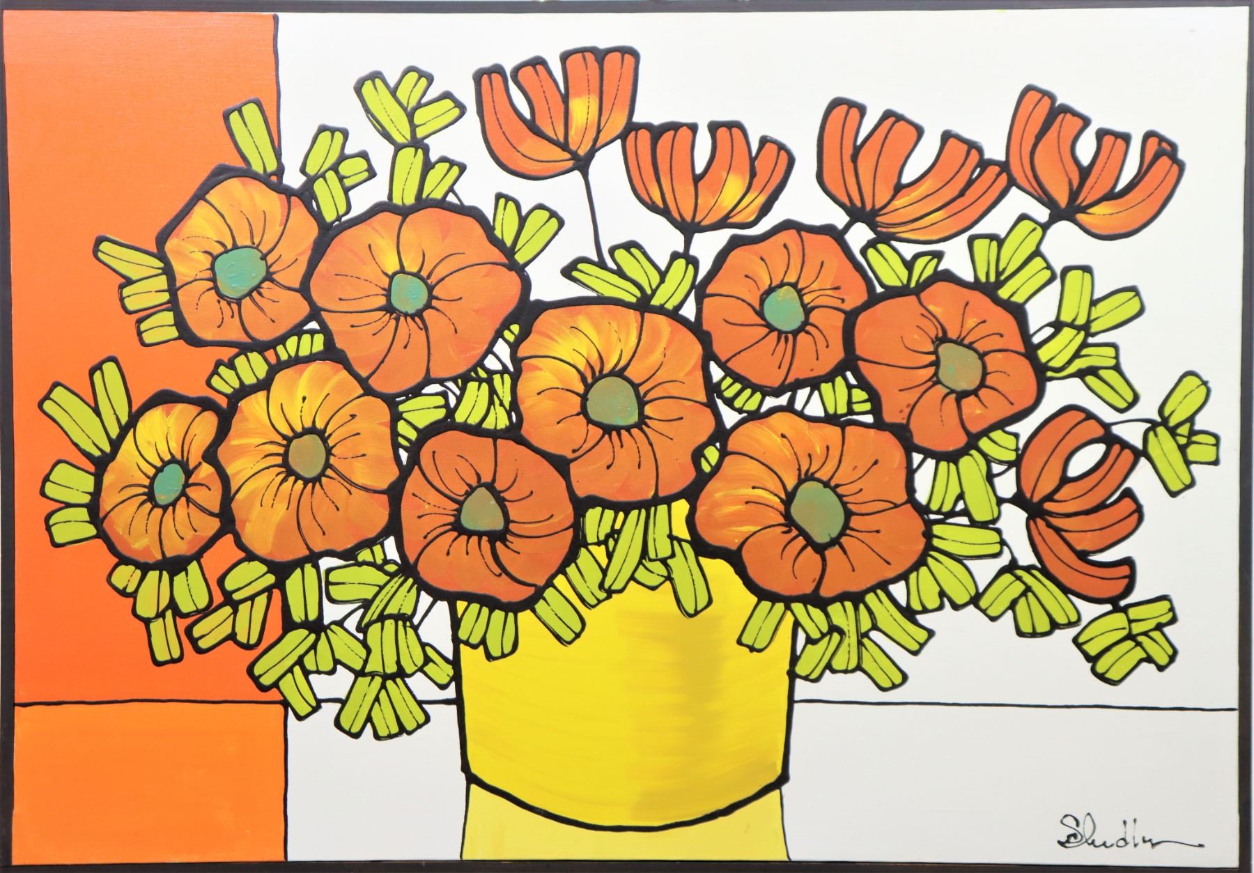 Stylized still life titled "Flowers in Pot", acrylic on canvas.