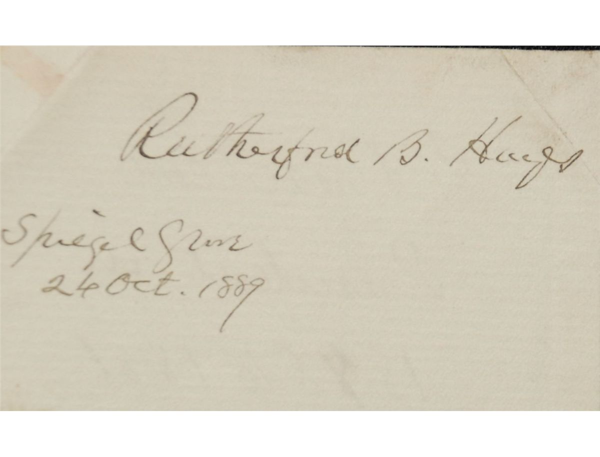 19th President of the United States (1877–1881). As president, he oversaw the end of Reconstruction period. Uncommon full signature on a slip of paper"Rutherford B. Hayes Spiegel Grove, 24 Oct. 1889"