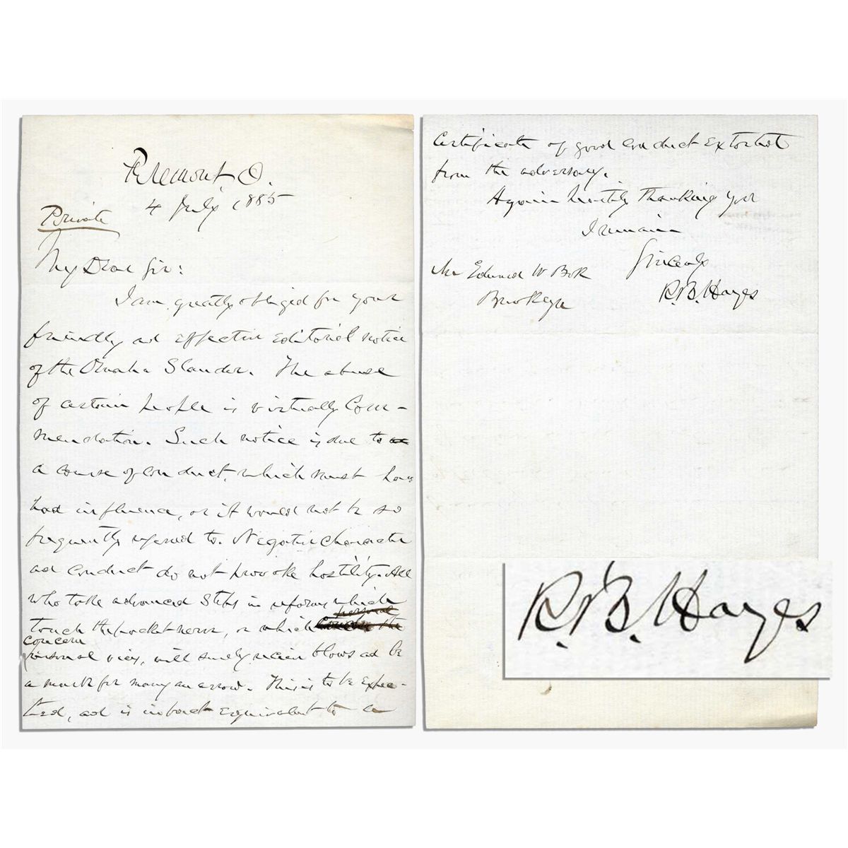 Autograph letter signed by Rutherford B. Hayes dated 4 July 1885 from Fremont, Ohio. Marked ''Private'', Hayes' letter to magazine editor Edward Bok refers to what Hayes calls the ''Omaha Slander,'' a scandal in which Eugene Field, an anti-Hayes columnist for the ''Chicago Daily News'' (and whose father, incidentally, defended Dred Scott), accused Hayes of hypocrisy for keeping a dry White House, revealing that the former president was part-owner of a saloon property in Omaha, Nebraska. The temperance policy in the Hayes White House was rumored to be the doing of Mrs. Hayes, a prohibitionist - a fact that encouraged Field in his Hayes hazing. According to one source, Field went so far as to travel from Chicago to Omaha to visit and photograph the saloon in question. Bok, a friend of Hayes and editor of ''The Brooklyn Magazine'' apparently ran an article defending Hayes' reputation in the wake of the scandal, for which Hayes expresses his gratitude: ''My Dear Sir: I am greatly obliged for your friendly and effective editorial notice of the Omaha Slander. The abuse of certain people is virtually commendation. Such notice is due to a course of conduct which must have had influence, or it would not be so frequently referred to. Negative character and conduct do not provoke hostility. All who take advanced stabs in reform which touch the [?] nerves, or which concern personal vices, will surely receive blows and be a mark for many an arrow. This is to be expected, and is, in brief, equivalent to a certificate of good conduct extorted from the adversary. Again honestly thanking you / I remain / Sincerely / R.B. Hayes''. Interestingly, in another letter to Bok, Hayes admits part-ownership of the property, but does not claim any wrongdoing in so owning. 2pp. letter measures 5.25'' x 8.25''. Near fine.