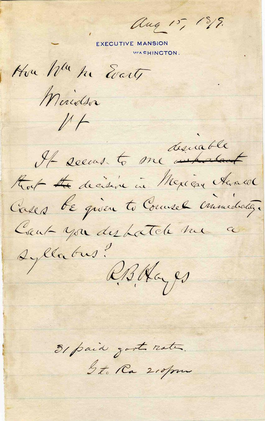 Rutherford B. Hayes autograph letter signed as President on executive mansion letterhead, dated 15 August 1879 from Hayes' residence in Windsor, Vermont. Letter, addressed to Secretary of State William M. Evarts, was written amid mounting tensions between Mexico and the United States regarding fraudulent claims made against Mexico by an American silver mining company. The Mexican government became irate when Hayes' administration refused to compensate Mexico for what it had already paid to the claimant. President Hayes, reacting to Mexico's outrage, here writes to Secretary Evarts: ''It seems to me desirable that the decision in Mexican Award Cases be given to Counsel immediately. Can't you dispatch me a syllabus? / R.B Hayes''. One-page letter, measuring 5.5'' x 9'', has significant staining on verso, else near fine.