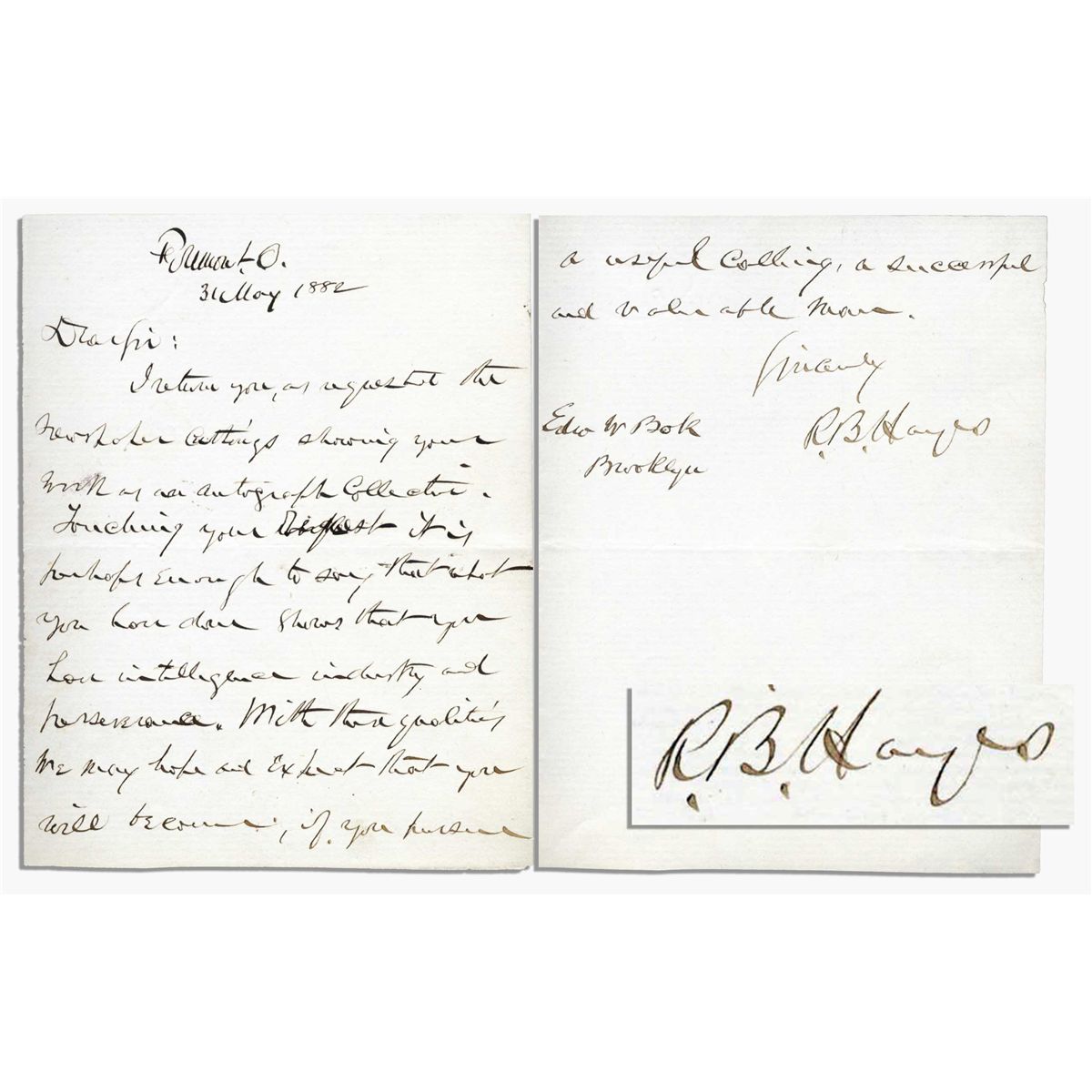Rutherford B. Hayes autograph letter signed, dated 31 May 1882 to a 19-year old Edward Bok, future editor of ''Ladies Home Journal.'' In part, ''I return…the newspaper cuttings showing your work as an autograph collector…what you have done shows that you have intelligence, industry and perseverance. With these qualities we may hope and expect that you will become, if you pursue a useful calling, a successful and valuable man. Sincerely, R.B. Hayes''. Two pages written on card style stationery, measuring 4.25'' x 5.5.'' Near fine condition.