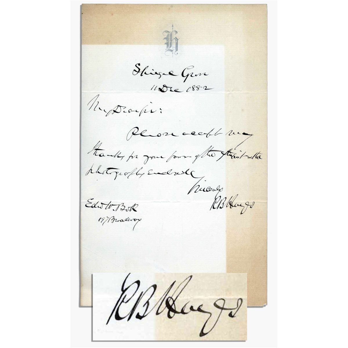 Autograph note signed by Rutherford B. Hayes on personalized stationery dated 11 December 1882 from his home in Spiegel Grove to writer and publisher ''Edw W. Bok / 197 Broadway''. Hayes thanks Bok for a photograph. He signs: ''Sincerely / R.B. Hayes.'' The single page letter, measuring 4.75'' x 7.75'', shows folds and and ''L'' shaped block of toning, else very good condition.