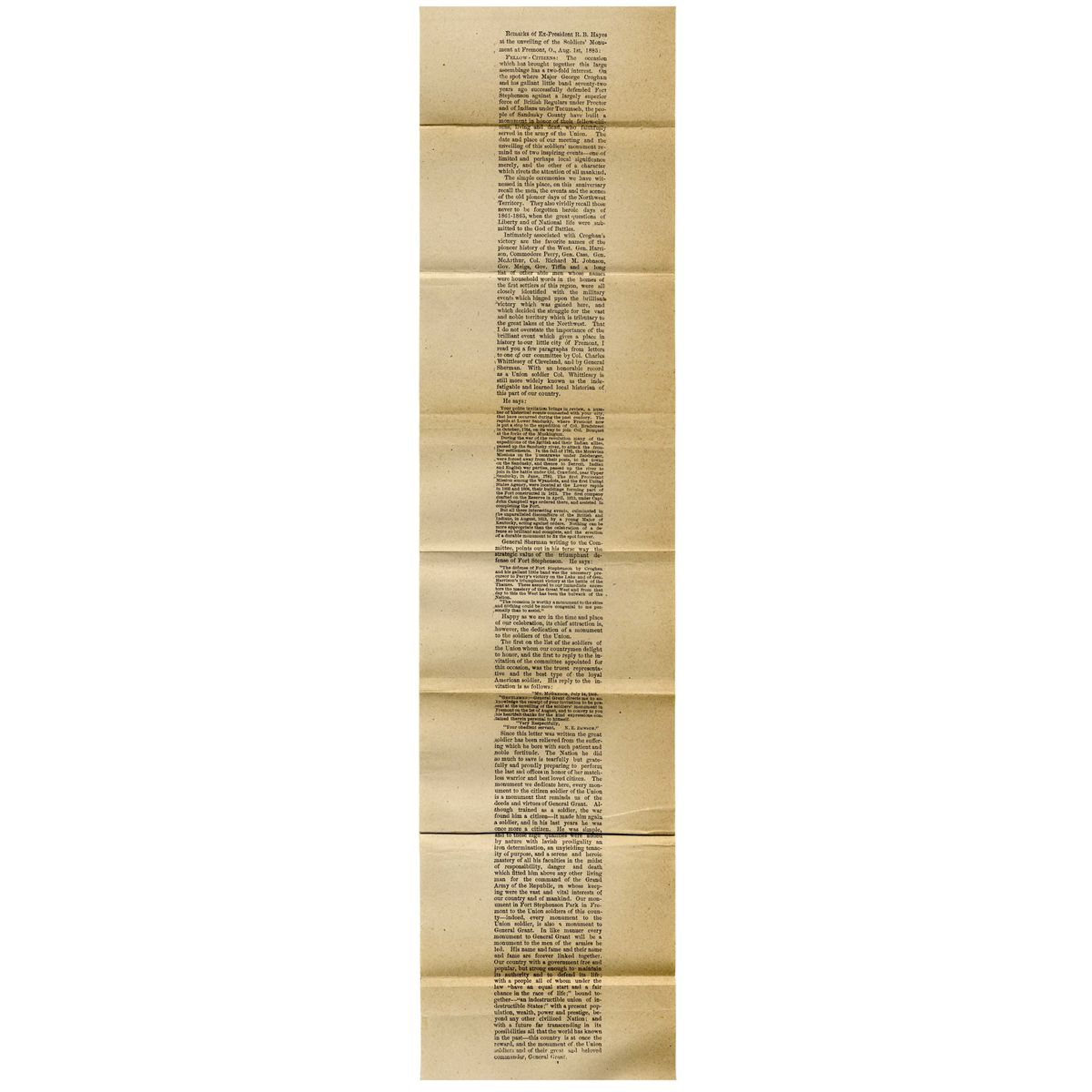 Rutherford B. Hayes autograph note signed with envelope marked ''Personal'' to his friend Edward Bok, future Pulitzer Prize winner. Note reads in full, ''To Mr. Edw. M. Bok / With thanks + best wishes / R.B.Hayes''. Hayes also encloses a copy of a speech he gave, dedicating a monument to the citizen soldiers who won the battle for Fort Stephenson during the War of 1812. Envelope postmarked 8 August 1885 is addressed in Hayes' hand. Note measures 5.5'' x 8.5'', envelope 3.5'' x 6.5'' and speech 5'' x 21.25''. All in very good condition.