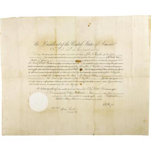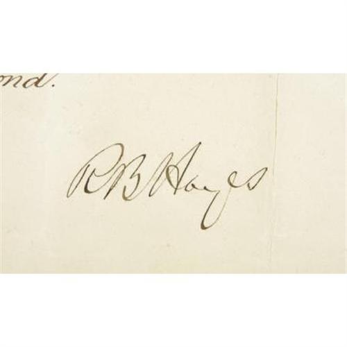 <B>Rutherford B. Hayes As President Partially Printed Document Signed,</B></I> “<I>R B Hayes</B></I>”, one page, 22” x 18”, Washington, D.C., June 3, 1878. An appointment naming John F. Hazelton U.S. Consul at Genoa. Countersigned by Secretary of State William M. Evarts and affixed with State Department seal. Moderate stains, minor paper loss along folds. Bold Hayes signature, good condition. <BR><BR><b>Shipping:</b> Flat Material, Large (<a target="_blank" href="http://www.heritageauctions.com/common/shipping.php">view shipping information</a>)