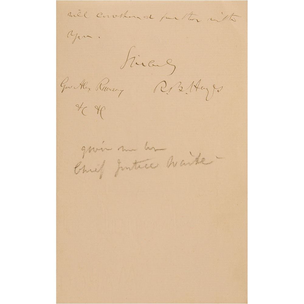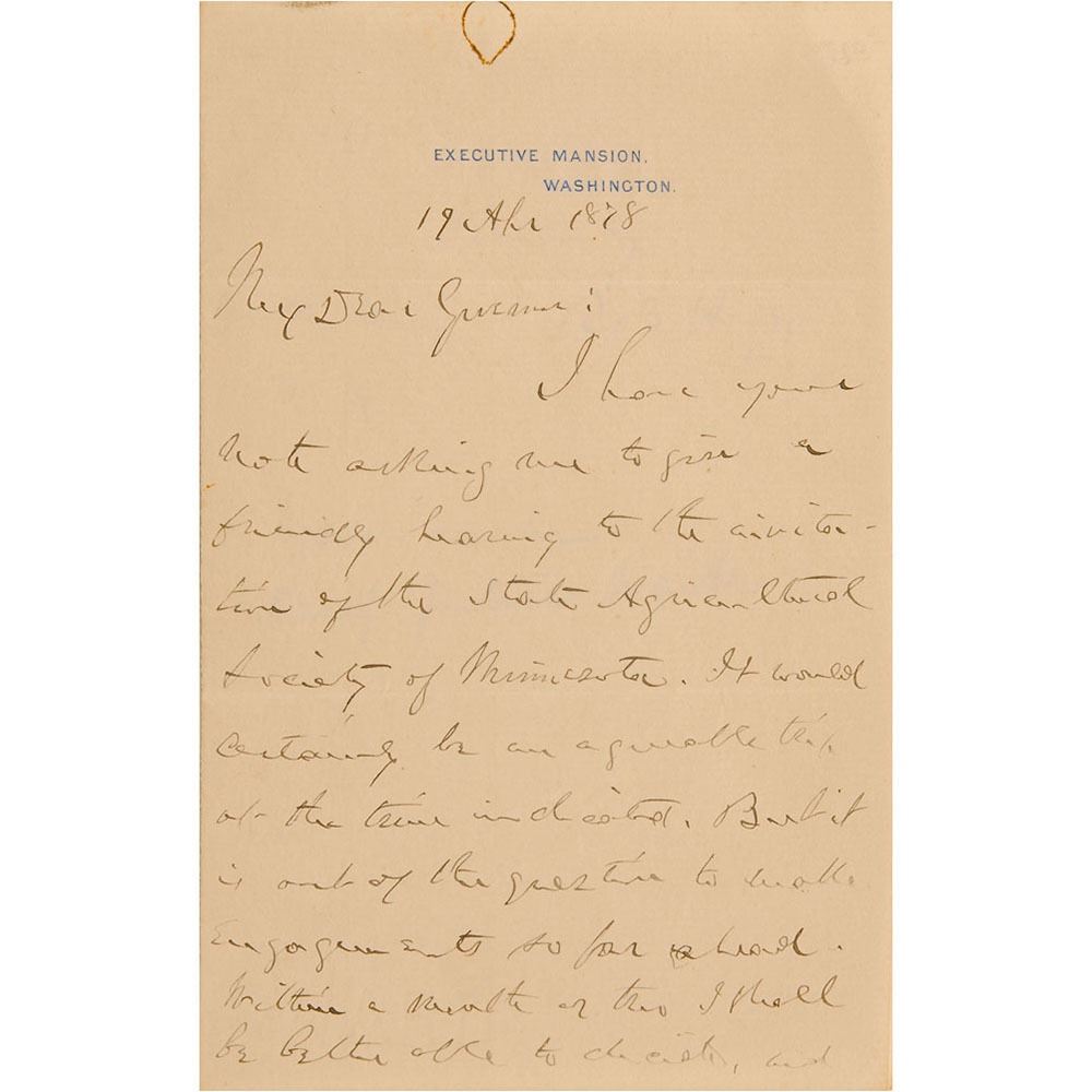 Rare ALS as president, signed “R. B. Hayes,†two pages on two adjoining sheets, 4.5 x 6.75, Executive Mansion letterhead, April 19, 1878. Letter to Minnesota Governor and his future Secretary of War Alexander Ramsey, in full: "I have your note asking me to give a friendly hearing to the invitation of the State Agricultural Society of Minnesota. It would certainly be an agreeable trip at the time indicated. But it is out of the question to make engagements so far ahead. Within a month or two I shall be better able to decide, and will correspond further with you." In fine condition, with rusty circular paperclip impression to the top of the first page.